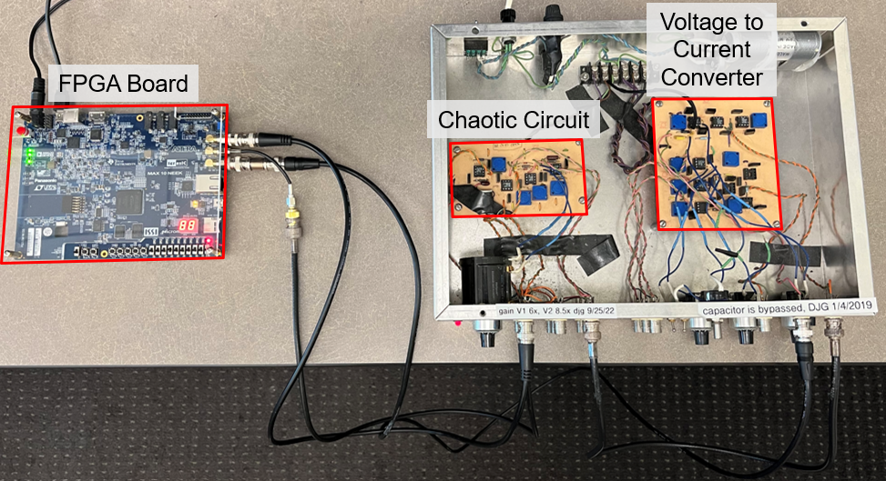 Our Controller and the Chaotic Circuit: (left) The FPGA board used to measure and perturb the chaotic circuit, and to evaluate the control algorithm. (right) The chaotic circuit and the voltage to current converter used to convert the perturbation from the FPGA board to a current.