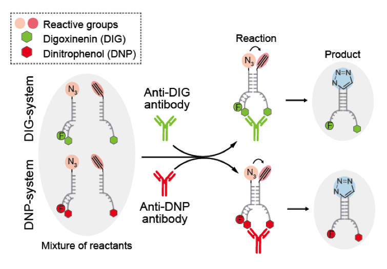 Figure 1. Orthogonal control of reactions mediated by different specific antibodies. Two systems with DNA templating pairs each labeled with a specific recognition element (DIG and DNP) were used in the same solution. One strand from each templating pair was also labeled with a different fluorophore to differentiate the products.