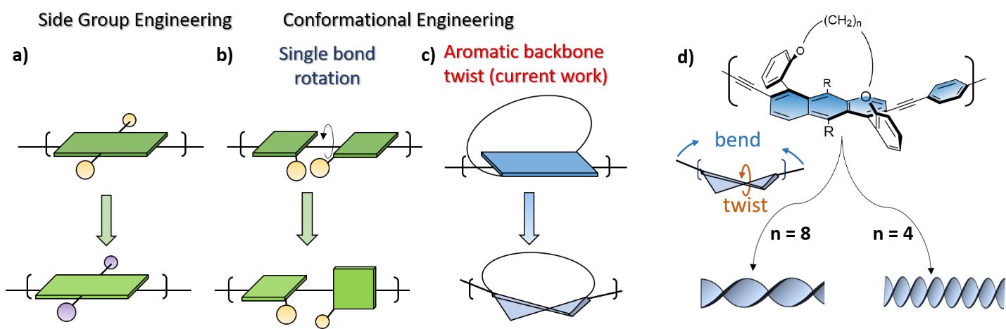 Figure 1. Approaches to tuning the properties of π-conjugated backbones. (a) Side-group engineering. Conformational engineering of the backbone by (b) single bond rotation and (c) aromatic backbone twist, as introduced by our group. (d) Molecular representation of the tethered twistacene π-conjugated oligomers depicted in (c). The length of the tether ((CH2)n, where n = 4, 6 or 8 methylene groups) determines the primary and secondary structures of the twistacenes upon twisting and bending, respectively, and eventually long backbones (polymers) adopt a secondary helical conformation exhibiting varying degrees of helicity. R = CC(CH3)3.