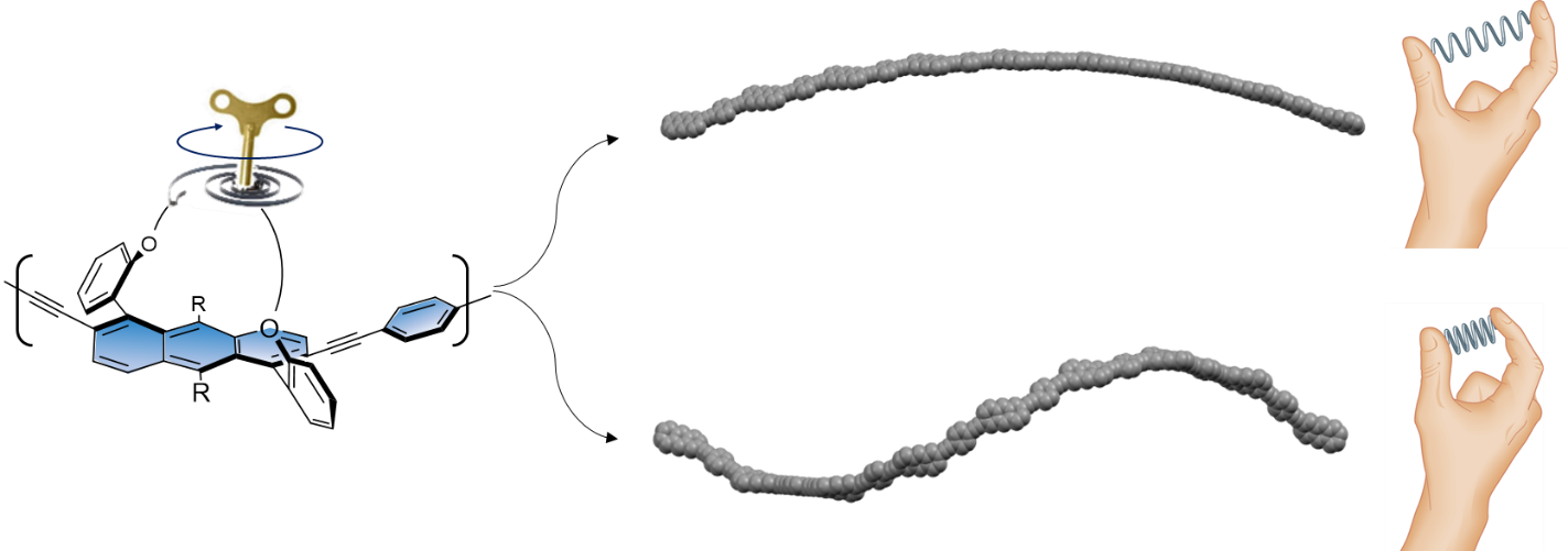 Focusing on acenes, because they are essentially one dimensional nanographenes and therefore the most fundamental polyaromatic hydrocarbon, we considered several candidates and investigated them computationally. We then endeavored to find synthetic methods for the most promising units. We showed that acenes can be twisted to a controlled extent by diagonally connecting the ends of the molecule using a covalent alkyl-ether tether of variable length. The degree of twisting induced by the tether directly affects the optical and electronic properties of the resulting twistacenes, with electron paramagnetic resonance (EPR) studies showing that electron delocalization is hardly affected by the twist. In the present work, we addressed the considerable synthetic challenge of extending the intrinsically helical acene unit to introduce oligomers of various length and twist, which we finally achieved through linkage via acetylene end-units, which were coupled to form oligomers of various lengths. The helicity of these oligomers is controlled by the aromatic unit twist, which is in turn controlled by the tether length (Figure 1d).