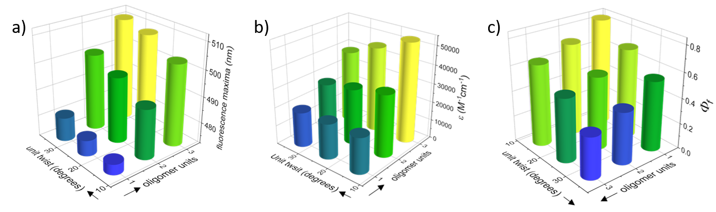 Having introduced π-conjugated backbones with different conjugation lengths and twist angles, we could explore the effect of both factors on the electronic, optical and chiroptical properties of the novel materials. We found that both backbone length and twist affect electronic and optical properties. Synergistic effects of increasing backbone length and twist affect properties such as the optical bandgap and the fluorescence maxima (Figure 2a), whereas antagonistic effects are observed for other properties, such as the extinction coefficient (Figure 2b). For fluorescence quantum efficiency, backbone twist has a greater effect than backbone length (Figure 2c).
