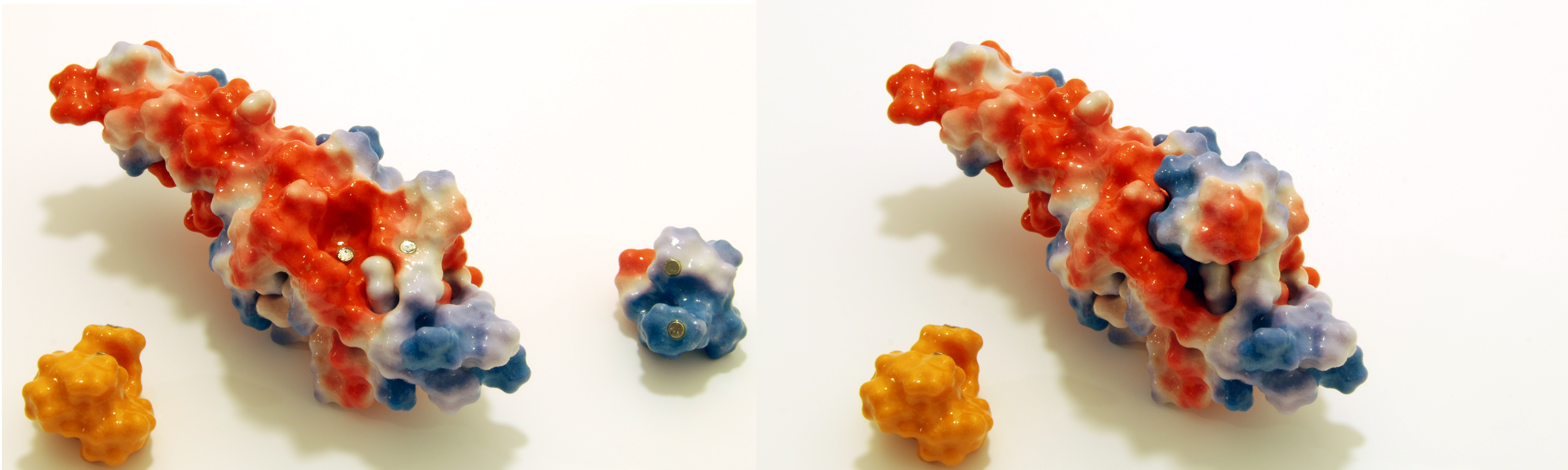 Figure 1. We use 3D printed models of protein structures as a teaching tool and in outreach activities. Here the GpsB protein surface is coloured by electrostatics, red for negative and blue for positive, and the little silver discs are magnets (left hand image) that help stick the peptidoglycan synthase peptide to GpsB. There is perfect shape and charge complementarity that explains the exquisite selectivity of the interaction (right hand image). Simpler colour schemes are also readily available (hence the orange peptide) and you should contact Darren Gowers at www.molecmodels.co.uk if you are interested in 3D-printed models of your own.