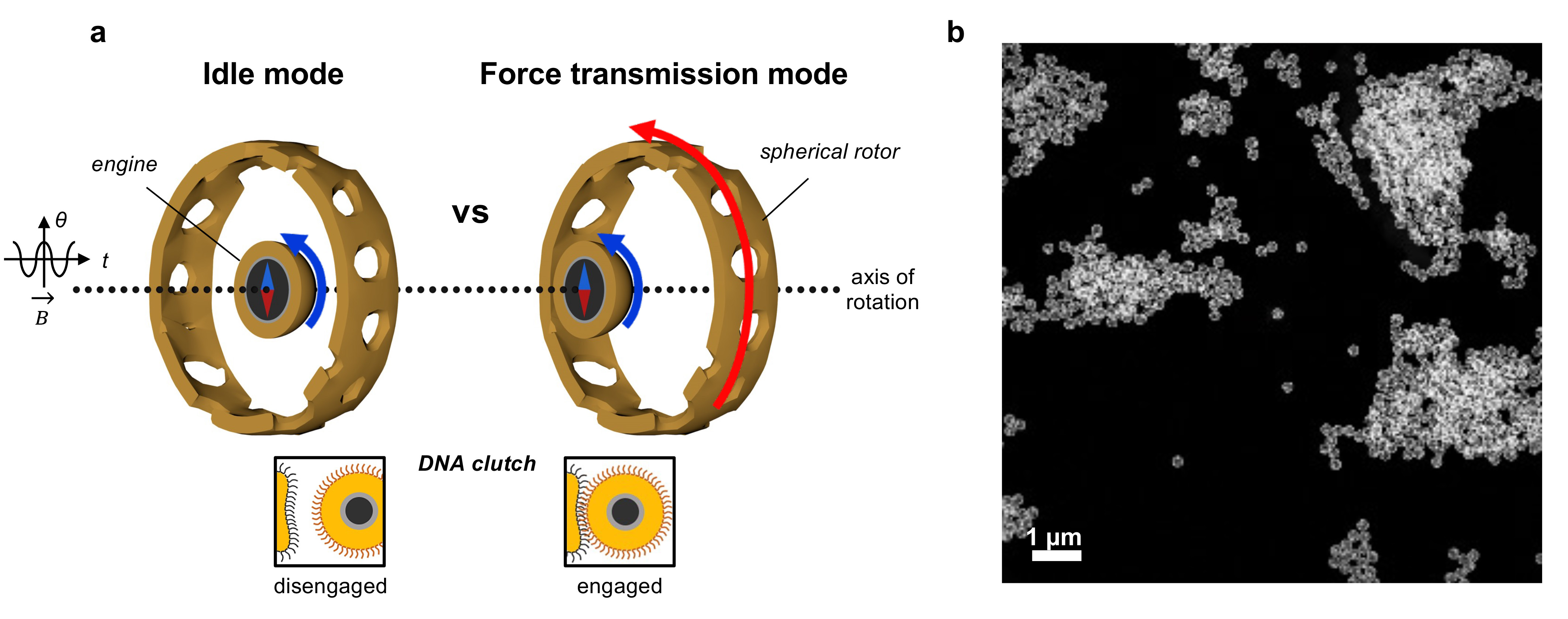 Figure 1. Design of the nanomachine with a clutch. a, Depiction of how the clutch functions. The magnetic engine-particle can reversibly engage with the porous rotor-cage by DNA hybridization. In the idle mode, the clutch is disengaged (‘off’ state), whereas in the force transmission mode (’on’ state), the received torque from the engine is transferred to the rotor. B, magnetic field; θ, rotating angle; t, time. b, Low magnification STEM image of many nanomachines with high uniformity.