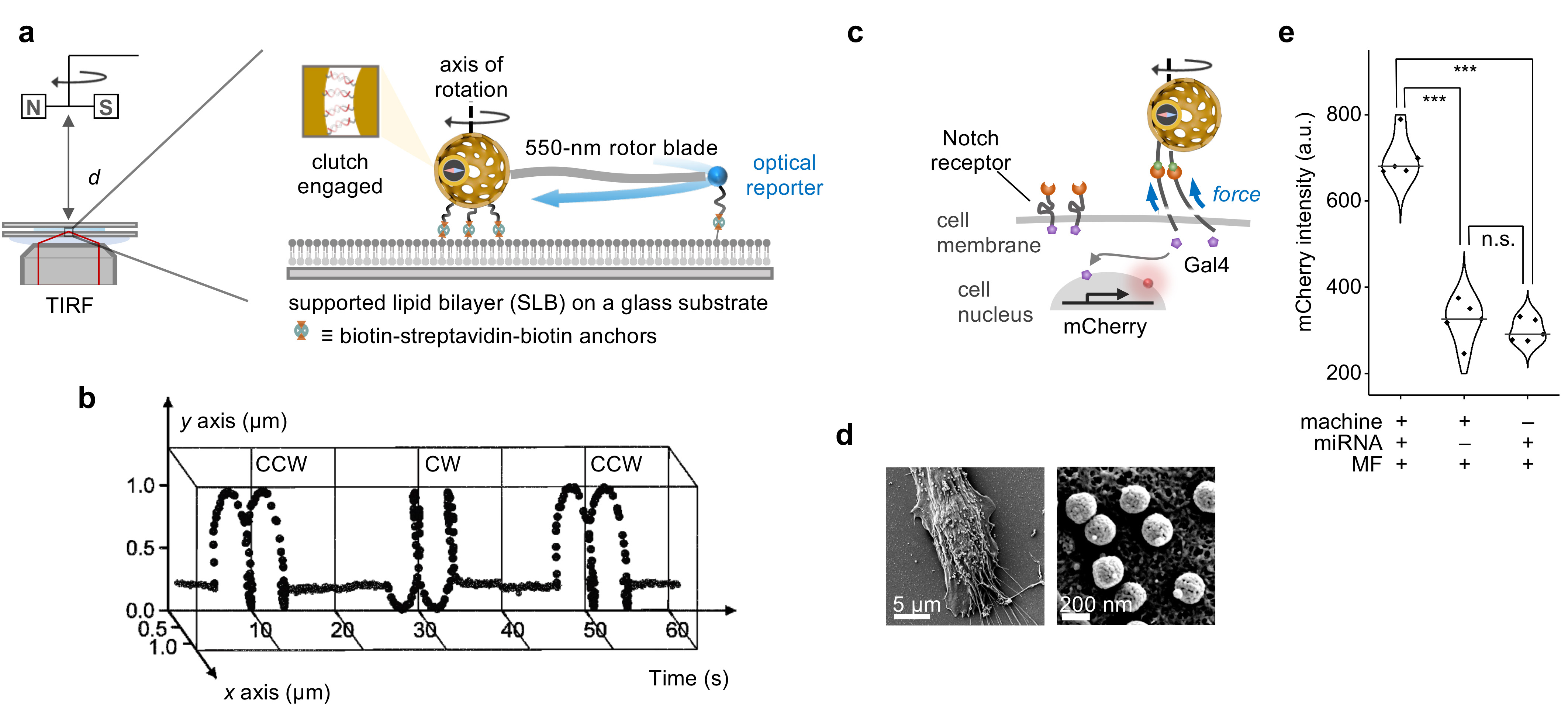 Figure 2. Rotational work output of the nanomachine. a, Experimental set-up for observing the rotational dynamics on a supported lipid bilayer under an inverted TIRF microscope equipped with distance tunable rotary magnetic fields for remote magnetic control. b, The trajectory of the optical reporter attached to the far tip of the rotor blade on the nanomachine under rotary magnetic fields. c, Schematic illustration of the nanomotor’s mechanical activation in vitro of Notch receptors in response to environmental miRNA. d, Scanning electron microscopy images of the labelled nanomotors on the cell. e, Statistical analysis of the mCherry fluorescence intensity of the experimental and control groups.