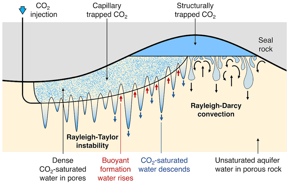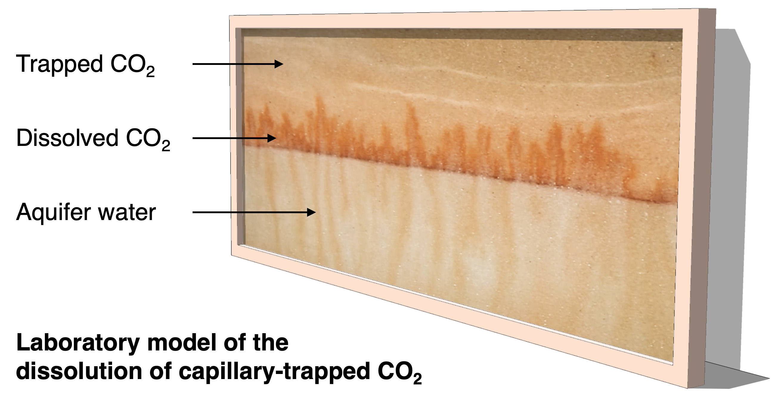 The experiment indicates that the pore water surrounding the trapped CO2 rapidly becomes saturated in CO2. Once saturated, the density of this water exceeds that of the background formation water. This leads to convective instability of the water in the aquifer, with fingers of dense, saturated water descending towards the base of the aquifer and fingers of buoyant, unsaturated water rising into the region with trapped CO2. This convective flow controls the dissolution of the CO2 in the aquifer.