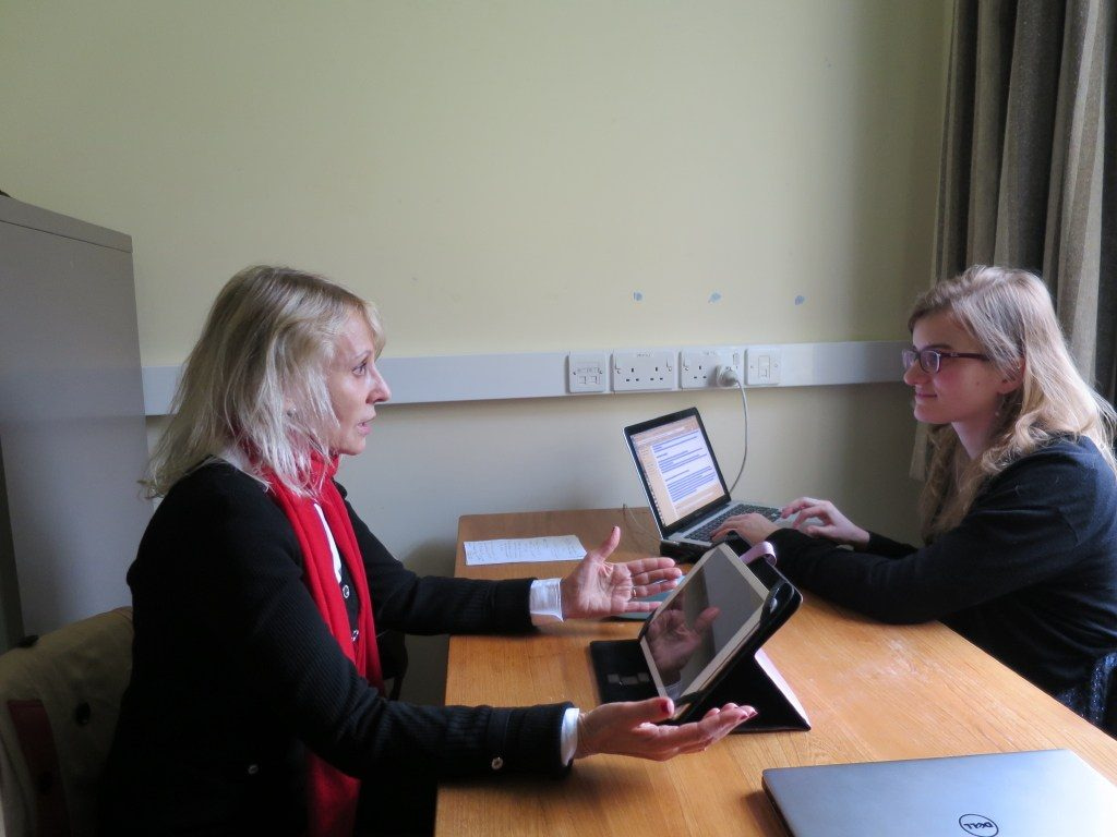 Professor Vesna Wallace meets with Seshat research assistant Agathe Dupeyron at the University of Oxford in February 2017 to discuss ancient Buddhism.