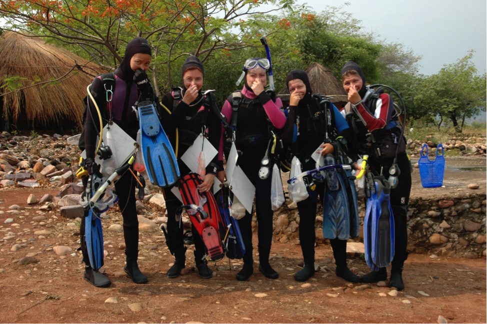 Researchers from the Aquatic Behavioural Ecology Laboratory prepare for a dive on the shore of Lake Tanganyika.
