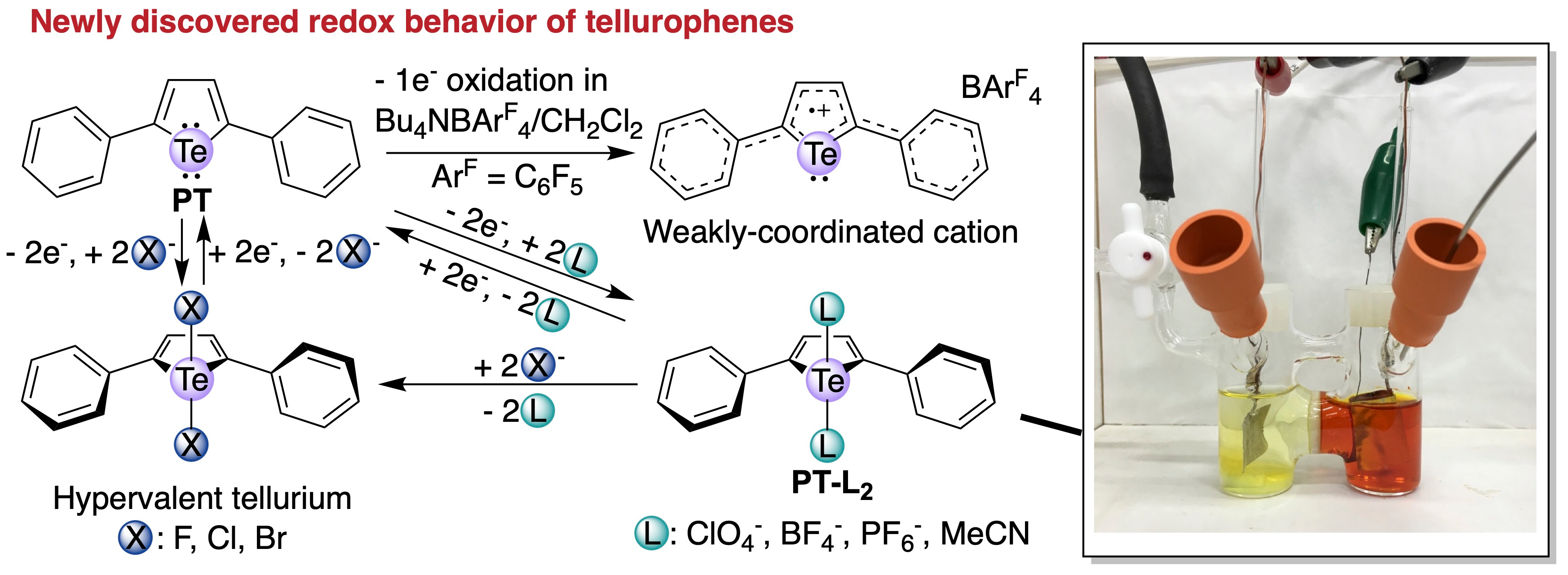 In our latest paper, we have reported the comprehensive study on the redox behavior of tellurium(II)-containing five-membered aromatic ring, tellurophene. This type of motif has attracted significant attention in both organic chemistry and material science.[1] Our collaborator, Prof. Seferos and his co-workers (University of Tronto) have previously reported unique reactions of tellurophene with halogene-based oxidants, such as Br2, ICl and XeF2, tellurophene to form hypervalent Te(IV) state such as PT-X2 (X = F, Cl, Br) as stable compounds. This reaction was also applicable for tellrophenes in conjugated polymeric backbone. However, the electrochemical aspect of redox chemistry of tellurophene has been unexplored.