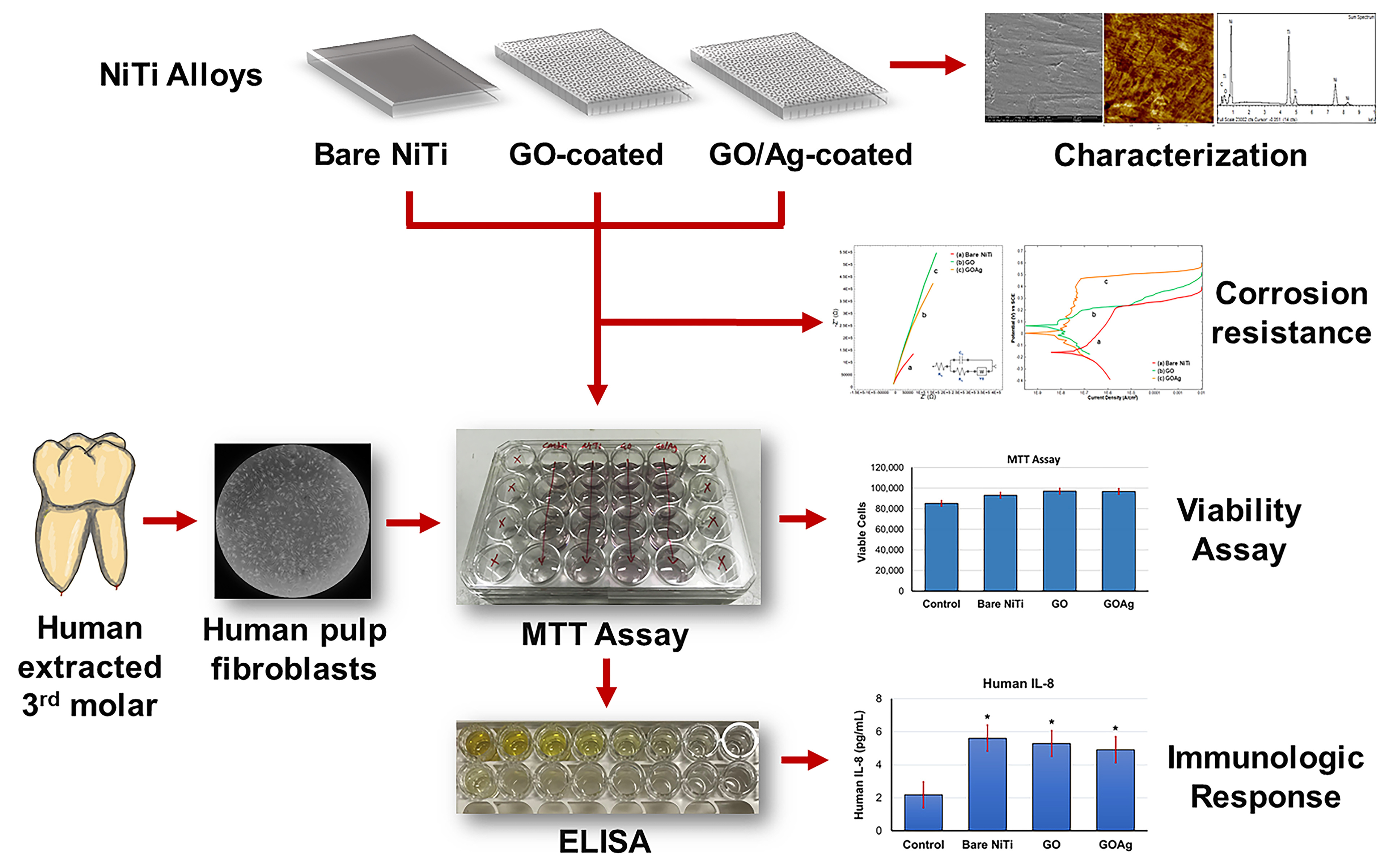 Graphene, invented in 2004, is an atom-thick sheet of carbon atoms that has potential applications in dentistry and medicine. Our work is published on Scientific Reports (https://www.nature.com/articles/s41598-020-60070-x) showed the anticorrosion properties of graphene oxide (GO) coatings and graphene oxide (GO)/Silver (Ag) coatings on NiTi alloys. The Ag nanoparticles (AgNPs) were used as they have shown strong antimicrobial properties against several pathogenic bacteria and virus. The corrosion resistance of the bare NiTi and coated NiTi samples were studied by the potentiodynamic polarization and electrochemical impedance spectroscopy in a 3.5