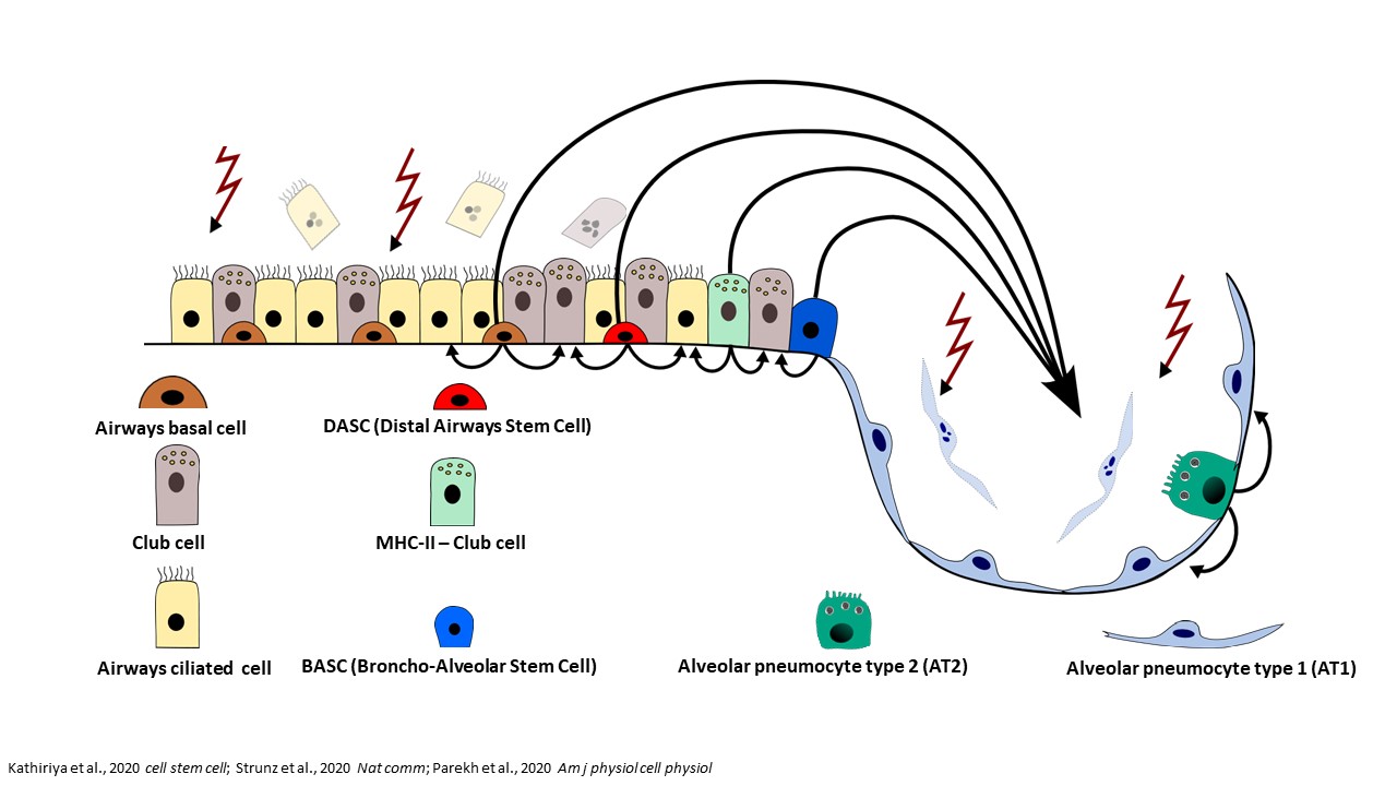 Many respiratory viruses damage the epithelial cells in the airways and the alveoli. The restoration of these structures depends on progenitor cells that can divide and differentiate into different cell types. The classical paradigm of lung regeneration states that airway epithelia are replenished by basal cells residing in bronchi and bronchioles, while alveolar AT1 cells are regenerated by transdifferentiating AT2 cells. This paradigm has been recently updated by the observation that, upon severe alveolar injury, multiple airway progenitor cells can mobilize to the alveoli and differentiate into AT2 and AT1 cells, aiding the regeneration processes (Figure 1).1,2,3,4