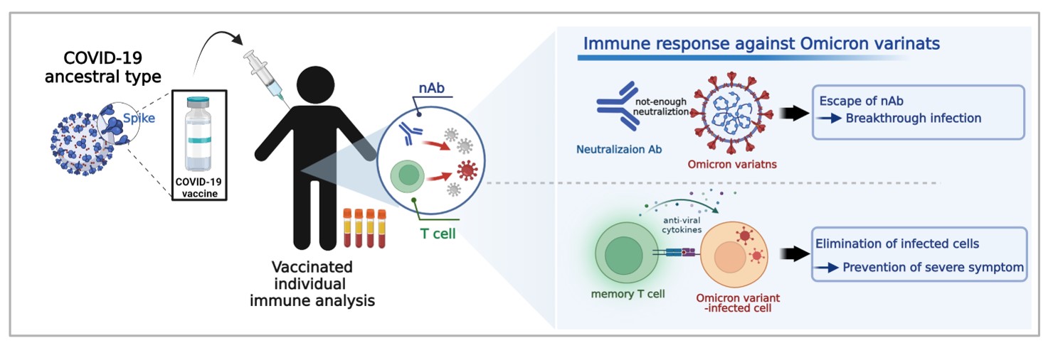 Several SARS-CoV-2 variants show considerable evasion of the neutralizing activity of antibodies; however, it is more difficult for variants to completely escape T-cell responses because the spike protein has multiple T-cell epitopes, depending on each individual’s allotype of the human leukocyte antigen. When the Omicron variant was first reported, our laboratory conducted in silico analysis of the amino acid sequences of T-cell epitopes, which were previously identified from the ancestral SARS-CoV-2 strain, in the Omicron variant. We found that over 80% of T-cell epitopes in the spike protein, and over 95% in proteins other than the spike, were fully conserved in the Omicron variant2. This finding suggested that memory T cells elicited by COVID-19 vaccination or infection would be effective against the Omicron variant.