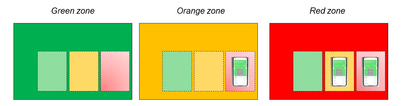 COVID certificates posed many practical and ethical issues regarding discrimination, confidentiality, certification, improper application, and dissent. In an attempt to balance these considerations we argued for their adoption, but only on a temporary basis and while ensuring equitable access via free vaccination and testing. Overall, COVID certificates could help avoid renewed closures, and thus preserve individual freedoms and protect the economy. Social venues, we argued, should be classified into three risk categories dependent on the duration and intensity of the interactions, and COVID certificates deployed only when and where necessary (see Figure below, where the color of the zone relates to its current epidemiological situation).