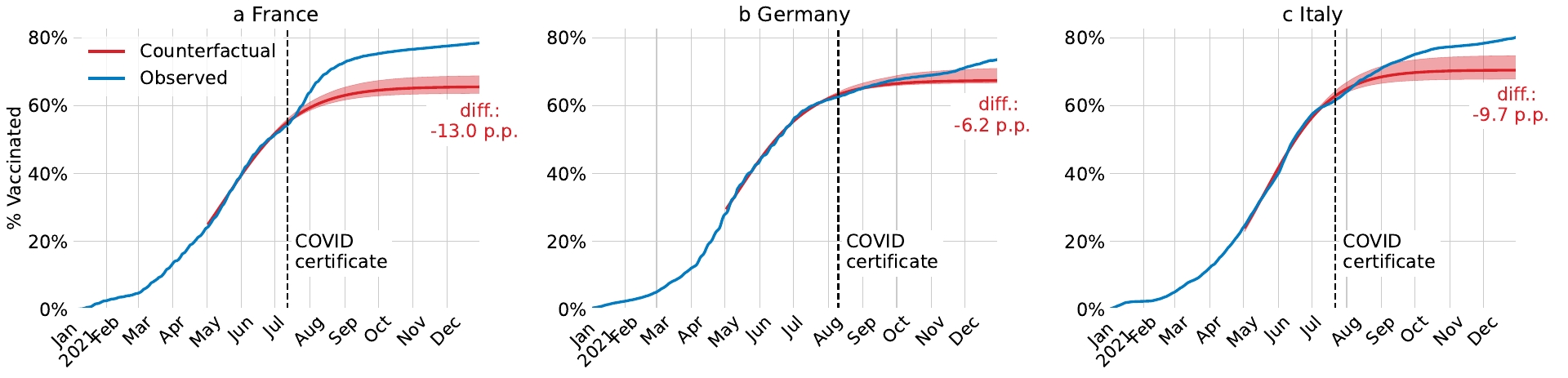 The estimated additional vaccine uptake varied across the three countries, likely because of different timing, vaccination hesitancy, and implementation rules (e.g., regional versus national adoption. On the day of their respective announcements, 54% of the population was vaccinated (i.e. had received at least one dose of a COVID-19 vaccine) in France, 63% in Germany, and 62% in Italy.; by the end of 2021, vaccination had risen to 78%, 74%, and 80%, respectively. How much of this increase can be attributed to COVID certificates? A substantial share: 13.0 (95% confidence interval: 9.7–14.9) percentage points (p.p.) for France, 6.2 (2.6–6.9) p.p. for Germany, and 9.7 (5.4–12.3) p.p. (See Figure below). An alternative statistical method (i.e., synthetic control), as well as an age-stratified model were used to validate the robustness of our findings.