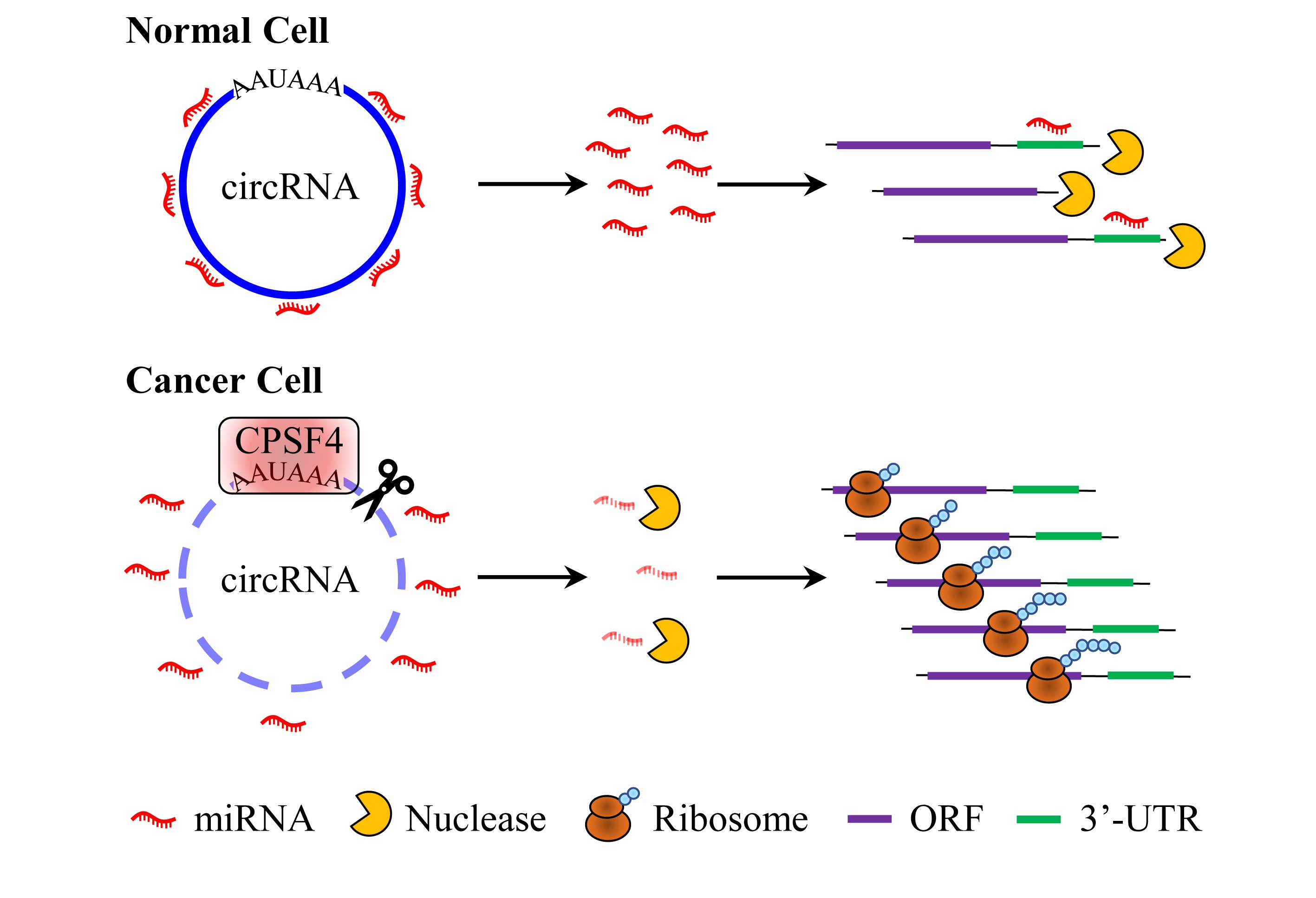In this study, clinical research has shown that CPSF4 expression is upregulated in HCC and that high expression of CPSF4 is associated with poor prognosis in HCC patients. Mechanistic studies have demonstrated that CPSF4 reduces the levels of circRNAs, which possess a polyadenylation signal sequence and this decrease in circRNAs reduces the accumulation of miRNA and disrupts the miRNA-mediated gene silencing in HCC. Experiments in cell culture and xenograft mouse models showed that CPSF4 promotes the proliferation of HCC cells and enhances tumorigenicity. Moreover, CPSF4 antagonizes the tumor suppressor effect of its downstream circRNA in HCC.