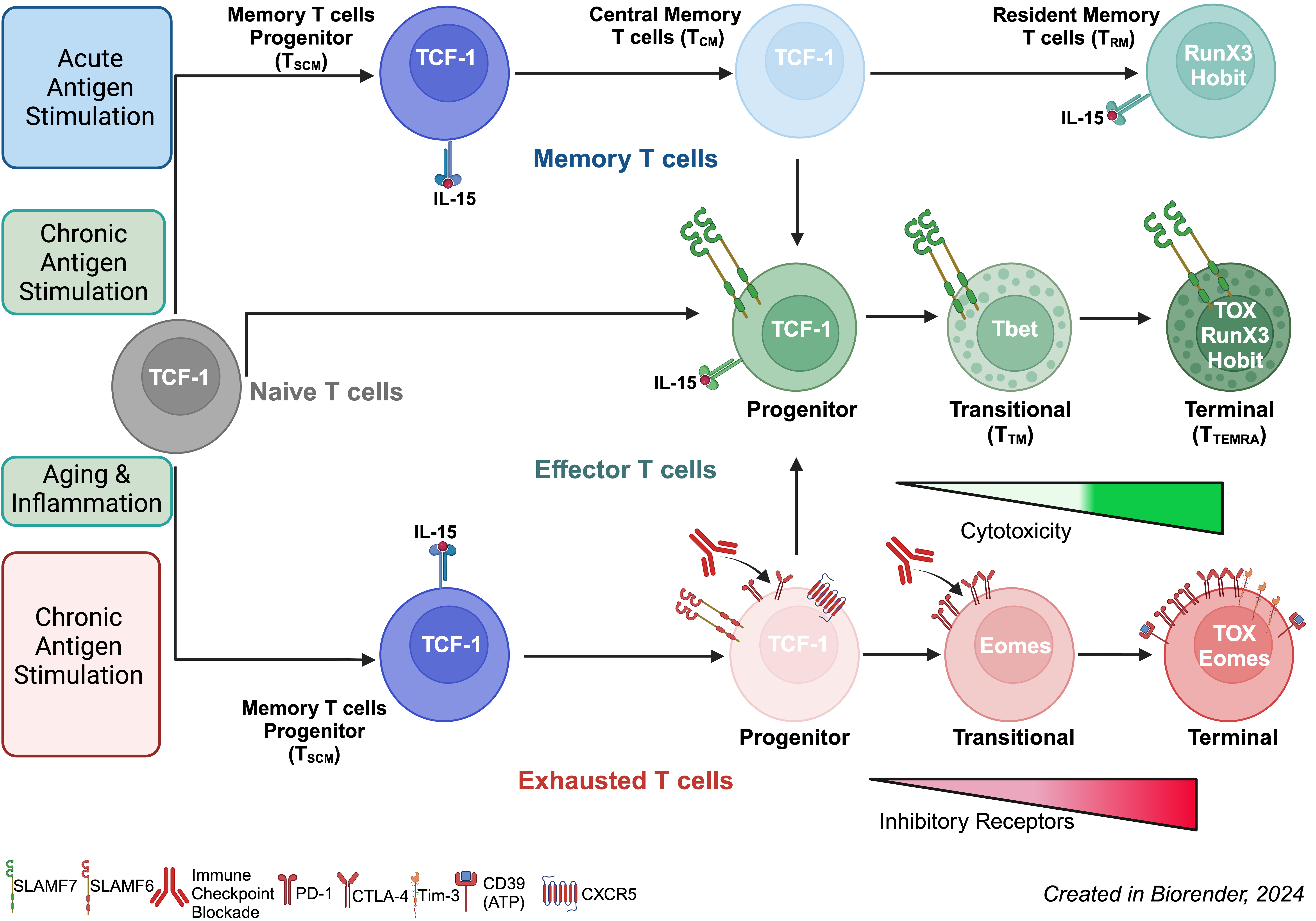 - TCF-1 and TOX: Exhausted T cells include subsets ranging from progenitor-like cells (TPEX) to terminal exhausted cells. TCF-1 determines the stemness of TPEX, enabling regeneration and effective response after immune checkpoint blockade therapies, (e.g., anti-PD-1 or anti-CTLA-4). In contrast, TOX acquisition is linked to multiple inhibitory receptors, proliferation/effector function loss, and metabolic changes.