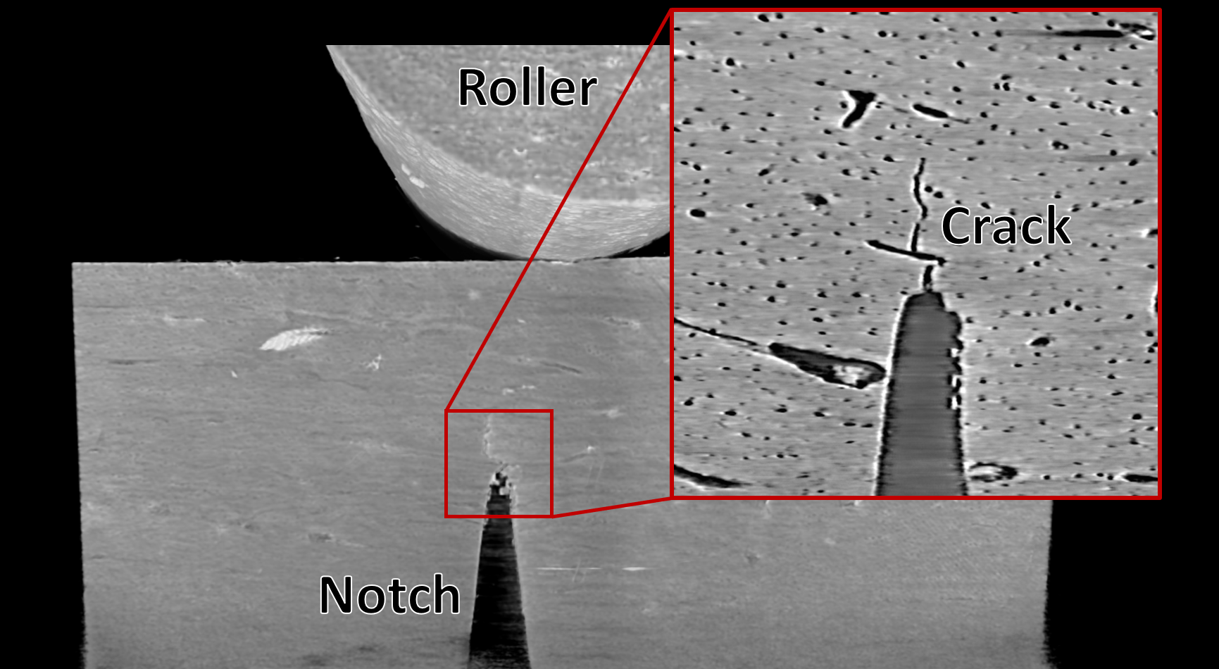 In this project, we had two aims: 1) to measure how well bone resists fracture using a toughness test and 2) to capture images of bone's internal structure and the shape of the crack during fracture using micro-CT. These two aims have competing interests. If the bone in the toughness test is imaged repeatedly using micro-CT, the toughness results will become unreliable due to radiation exposure's harmful effects on bone mechanics. Damage due to radiation is especially a problem when using synchrotron radiation micro-CT (SRμCT) imaging, which uses high flux x-rays to image at a microscopic scale.