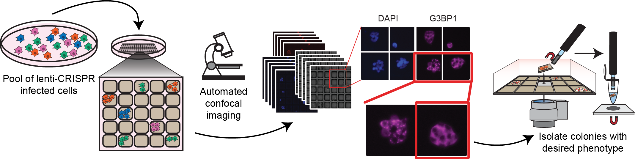 We start with a pool of cells, each of which contain a unique genetic knock-out from a lentiCRISPR library designed to target over 1,000 RNA binding proteins. These cells are plated on arrays where each cell forms a genetically distinct colony on individual microrafts that can be imaged for G3BP1 localization. We developed image-processing tools (https://github.com/YeoLab/CRaf...) to identify and select target wells with our phenotype of interest (no cytoplasmic G3BP1 puncta). To identify the infected CRISPR guide RNA in our target colony, the individual magnetized microraft is isolated physically from the array with a needle and collected into a PCR tube using a magnetic wand for PCR-based sequencing. Our proof-of-principle resulted in the identification of 6 previously known, and 17 additional RNA binding proteins that regulate the total stress granules abundance.