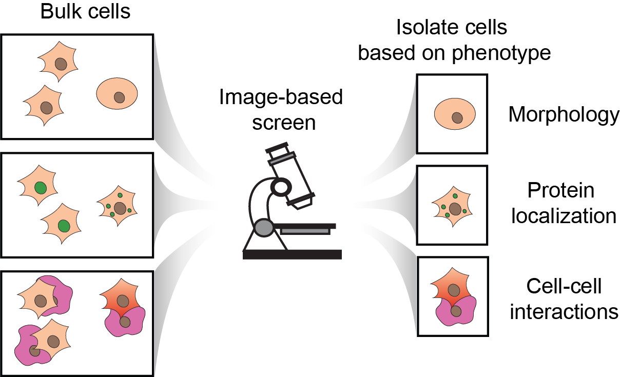 Figure 1. Cartoon of imaging-based phenotypes that can be assayed in bulk (left side) with an image-based screening platform to select clones with phenotypes of interest (right side).