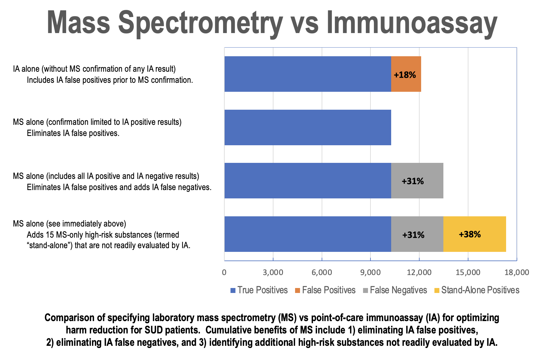 With regard to the superiority of laboratory mass spectrometry vs point-of-care immunoassay , our investigation is one of the first to report effectiveness of both the incidence and clinical relevance of using MS in a real-world, community clinic setting, not merely by eliminating false positives and false negatives but also by further leveraging mass spectrometry technology to identify other high-risk substances critical to optimizing harm reduction.