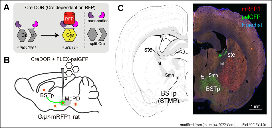 A, In this work, we created Cre dependent on RFP (Cre-DOR) by combining RFP-specific nanobodies and split-Cre. Specific binding of the nanobodies to RFP induces reunion of split-Cre into functional Cre recombinase. B, Local injection of virus vectors of Cre-DOR achieved specific expression of reporter palGFP in RFP-positive neurons in Grpr-mRFP1 transgenic rats. C, We revealed novel neural projections using Cre-DOR virus in RFP-expressing transgenic animals.