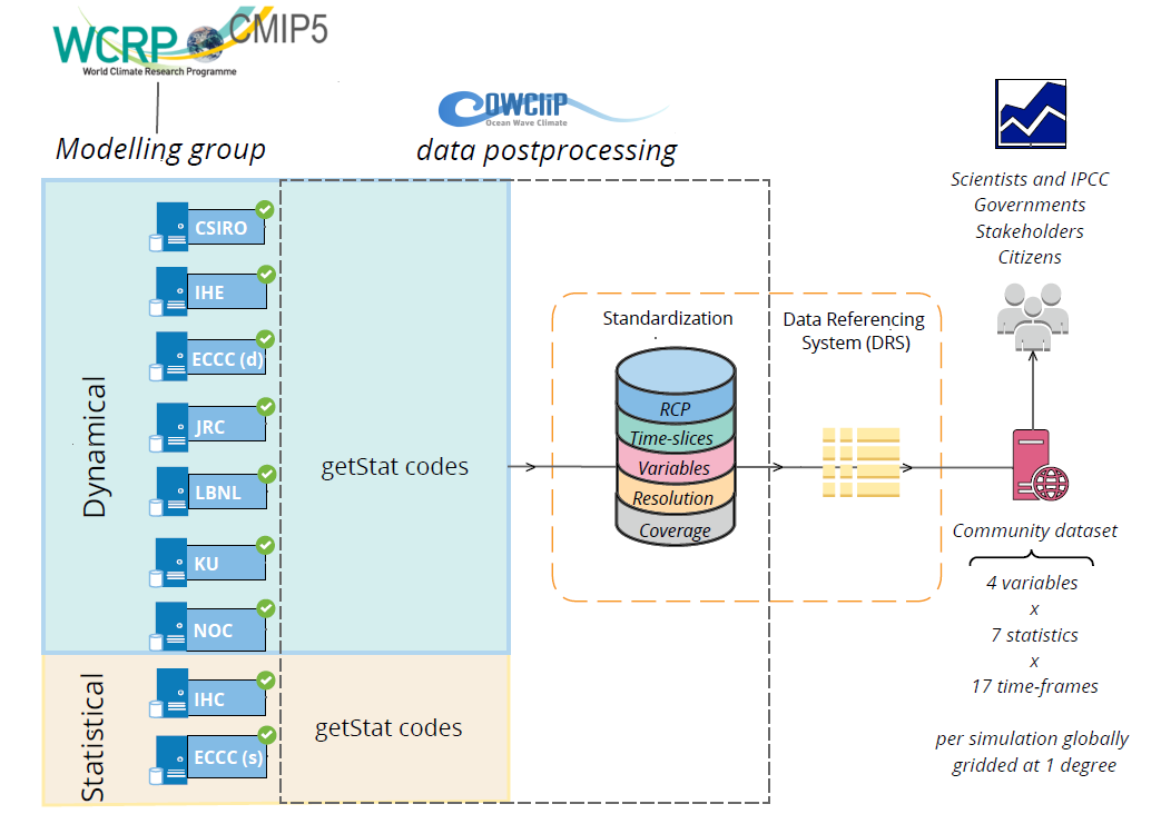 Modelling groups processed their raw wave model outputs to generate a common set of monthly, seasonal and annual statistics for 3 key wave variables (height, period and direction), using post-processing code supplied to all modelling groups. Groups uploaded their contributing data to a central server, and provided metadata describing model configuration and forcing data (winds from CMIP5-era global climate models, sea ice, and bathymetry) and references.