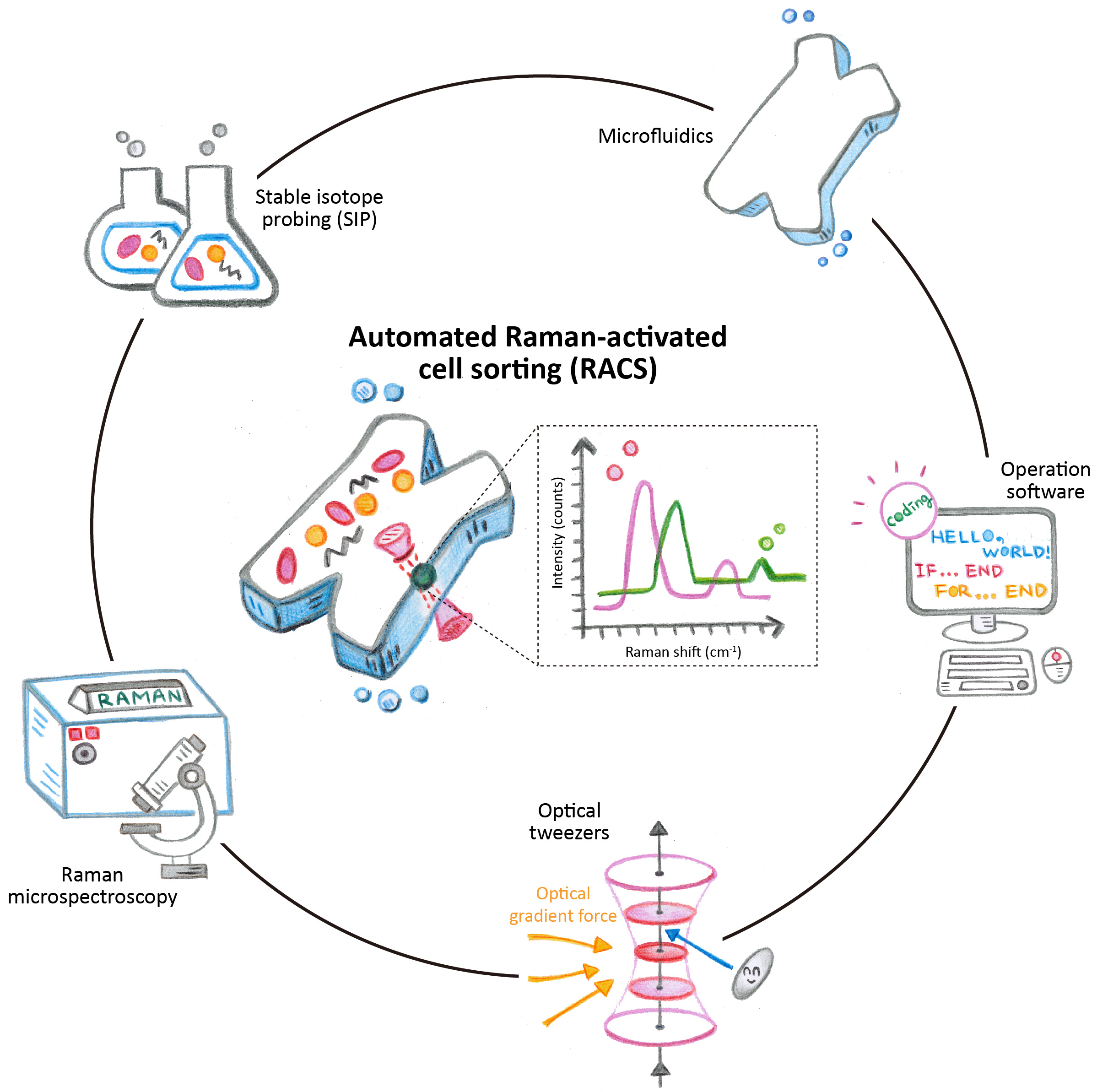 Our platform evolved by inspiration from FACS. It is based on our realisation that Raman microspectroscopy could be used to identify and thus sort individual cells that perform a specific function within a complex microbial community. Raman technology has great potential in aquatic and environmental microbiology as it can measure the molecular composition of microbes (e.g., lipids, proteins, carbohydrates, DNA/RNA, carotenoids, or introduced markers) in situ at the level of a single cell. Raman measurements of individual microbes can thus be used to detect cells possessing biomolecules of interest (e.g., carotenoids, cytochromes) or cells labelled with a stable isotope (e.g., deuterium, 13C). This yields enormous versatility, allowing sorting of cells on the basis of extremely diverse ecological functions without the need for specific fluorescent stains.