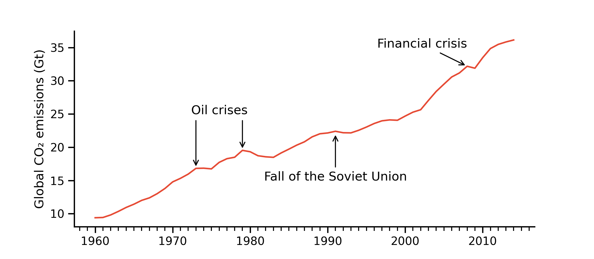 We have seen many crises in the past, and in terms of CO2 emissions, all have had the same effect: a brief dip in emissions, and then a bounce-back to roughly the same trajectory again, as displayed in Figure 1. In graphs of global yearly CO2 emissions, even very dramatic crises are hardly visible. To a large extent, this is because economic crises tend to be either relatively short or limited in space. Most countries are not strongly affected or the effects pass quickly so that, globally speaking, economic growth (and with it consumption and emissions) continue growing more or less as before.