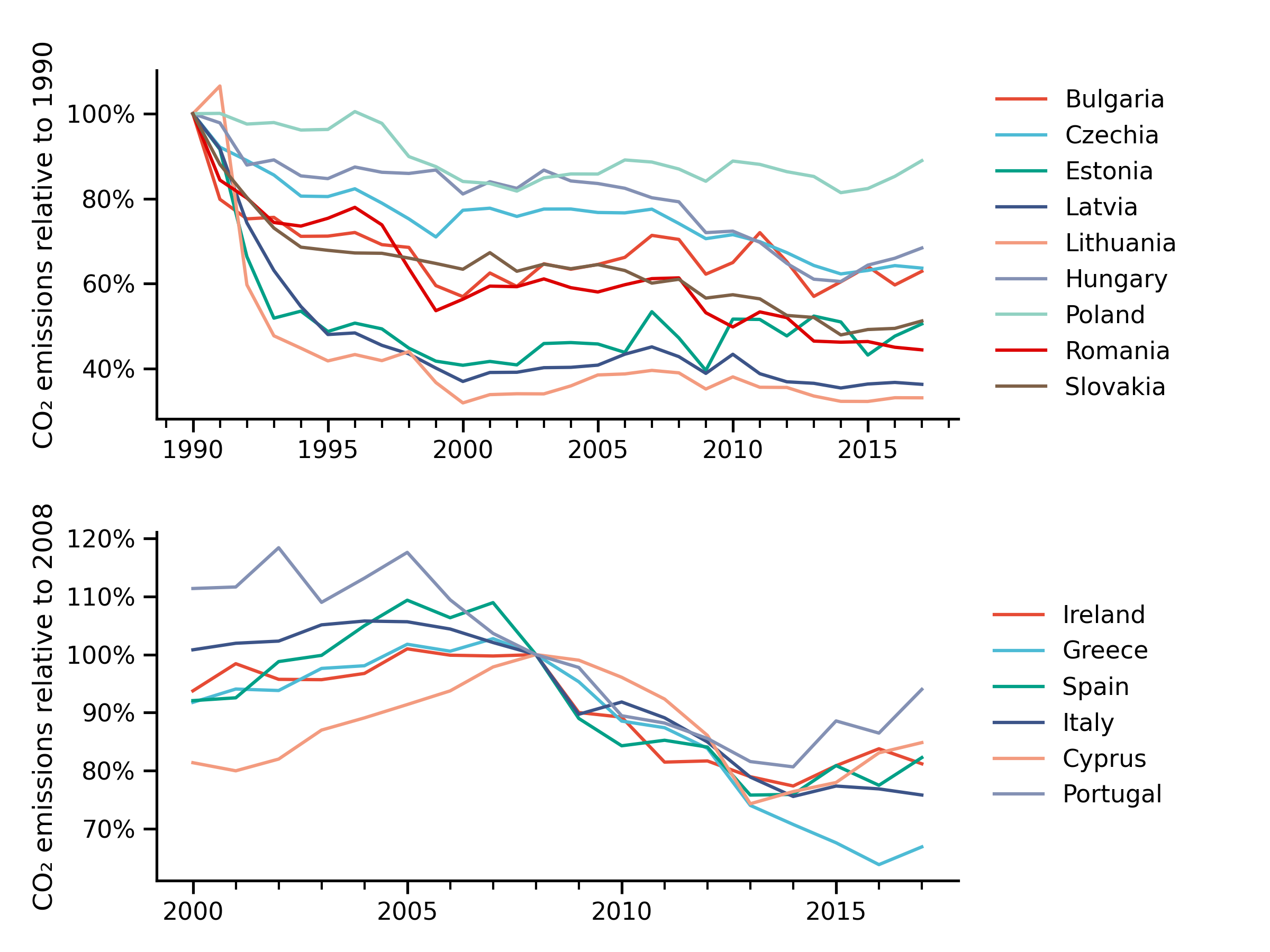 Figure 2: CO2 emissions of Eastern European countries (upper panel, 1990-2017, index 1990=100%) and Southern European countries (lower panel, 2000-2017, index 2008=100%). Source: Eurostat 2020.
