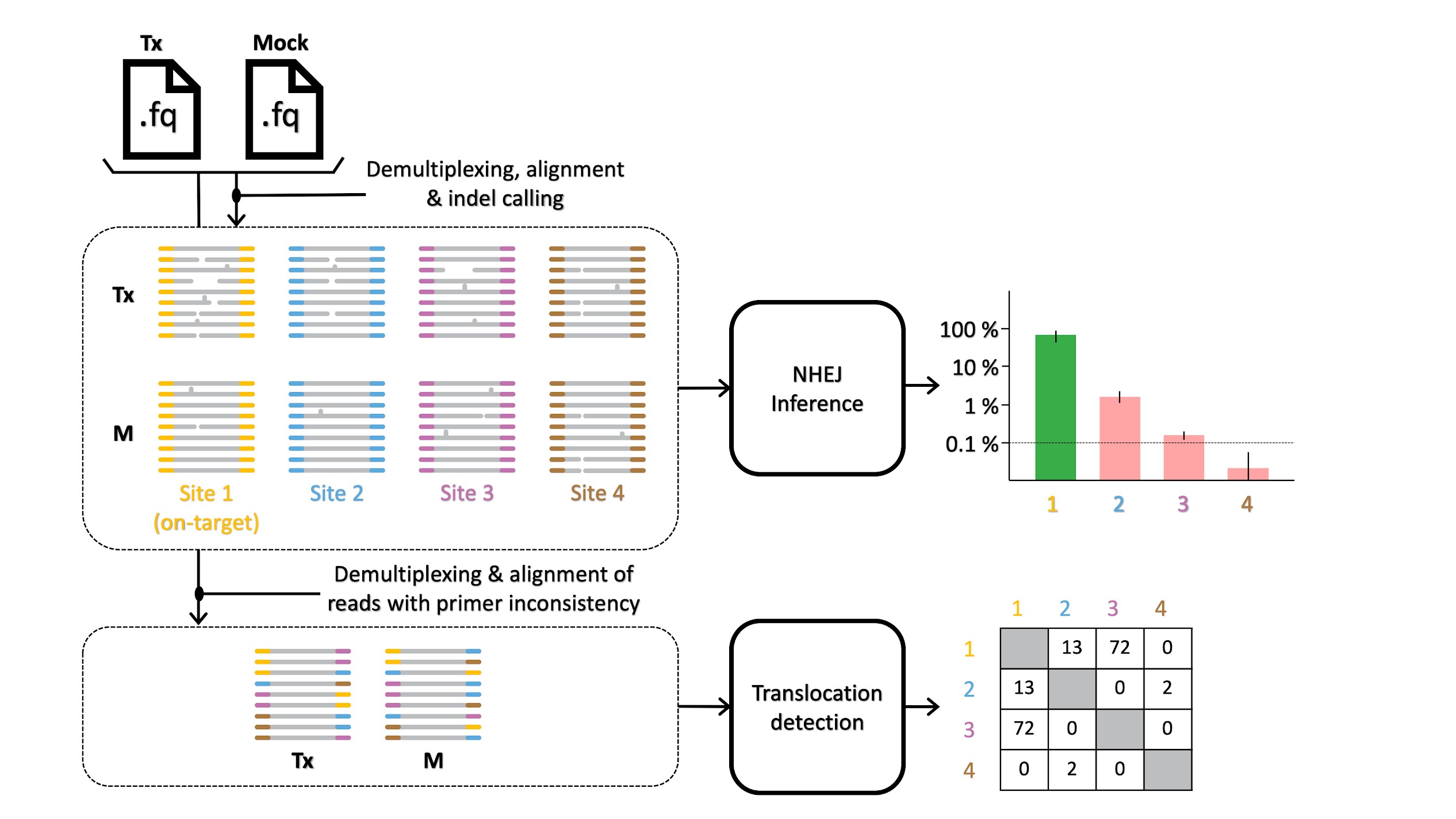 CRISPECTOR workflow: CRISPECTOR assigns each read in the Treatment and Mock (control) FASTQ files to a specific locus of interest or a putative translocation. Then, a Bayesian inference classifier accurately estimates the indel editing activity, and a hypergeometric test is performed to detect translocation reads
