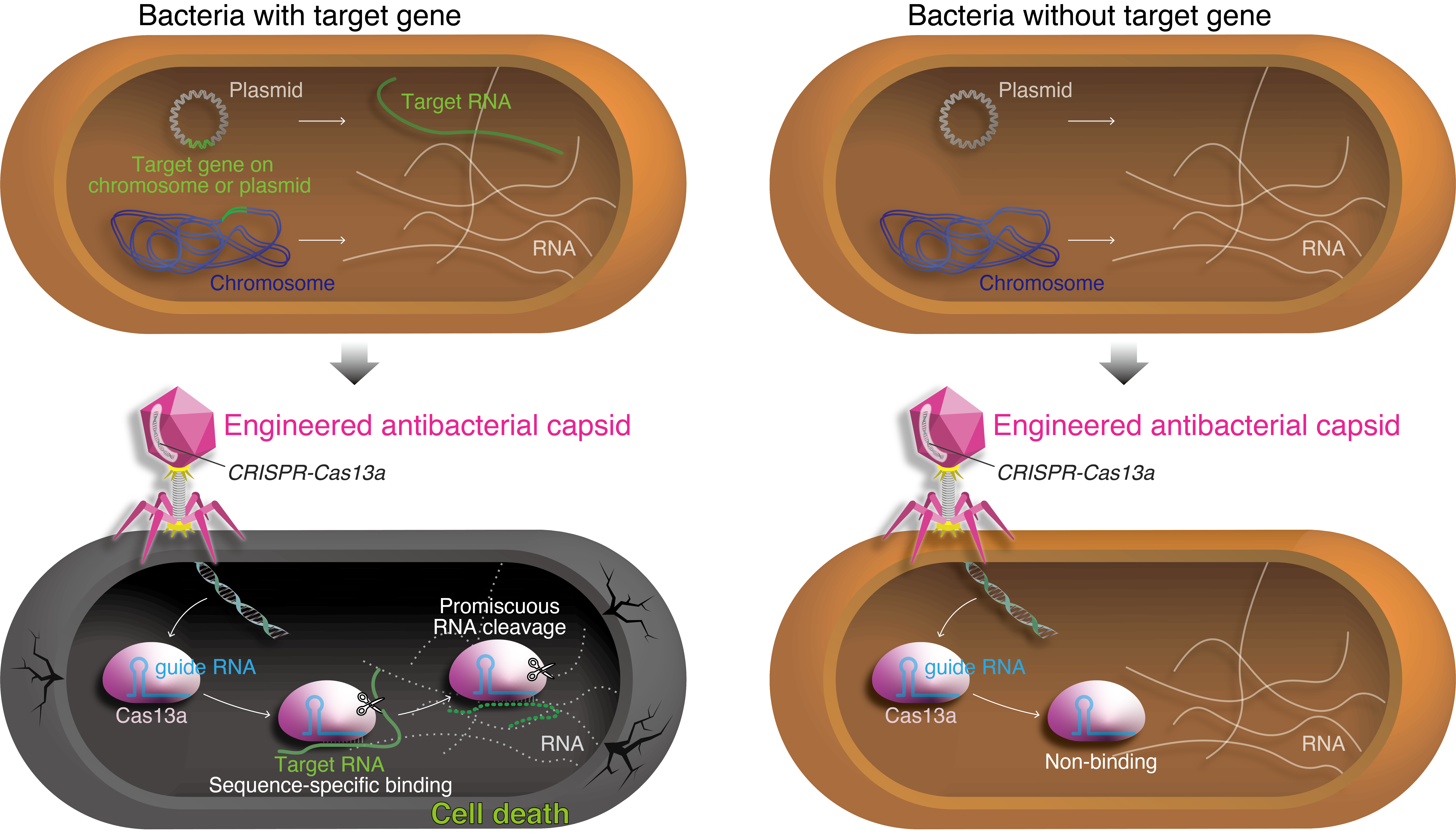 We also demonstrated several potential applications that the CapsidCas13a(s) antimicrobials are promising to be developed; i) as antibacterial therapeutic agents targeting any bacterial gene, including antibacterial resistance genes; ii) as a bacterial gene detection system without nucleic acid amplification and optic devices, and iii) as tools to manipulate the bacterial flora by eliminating a certain bacterial population without disrupting irrelevant bacterial populations.