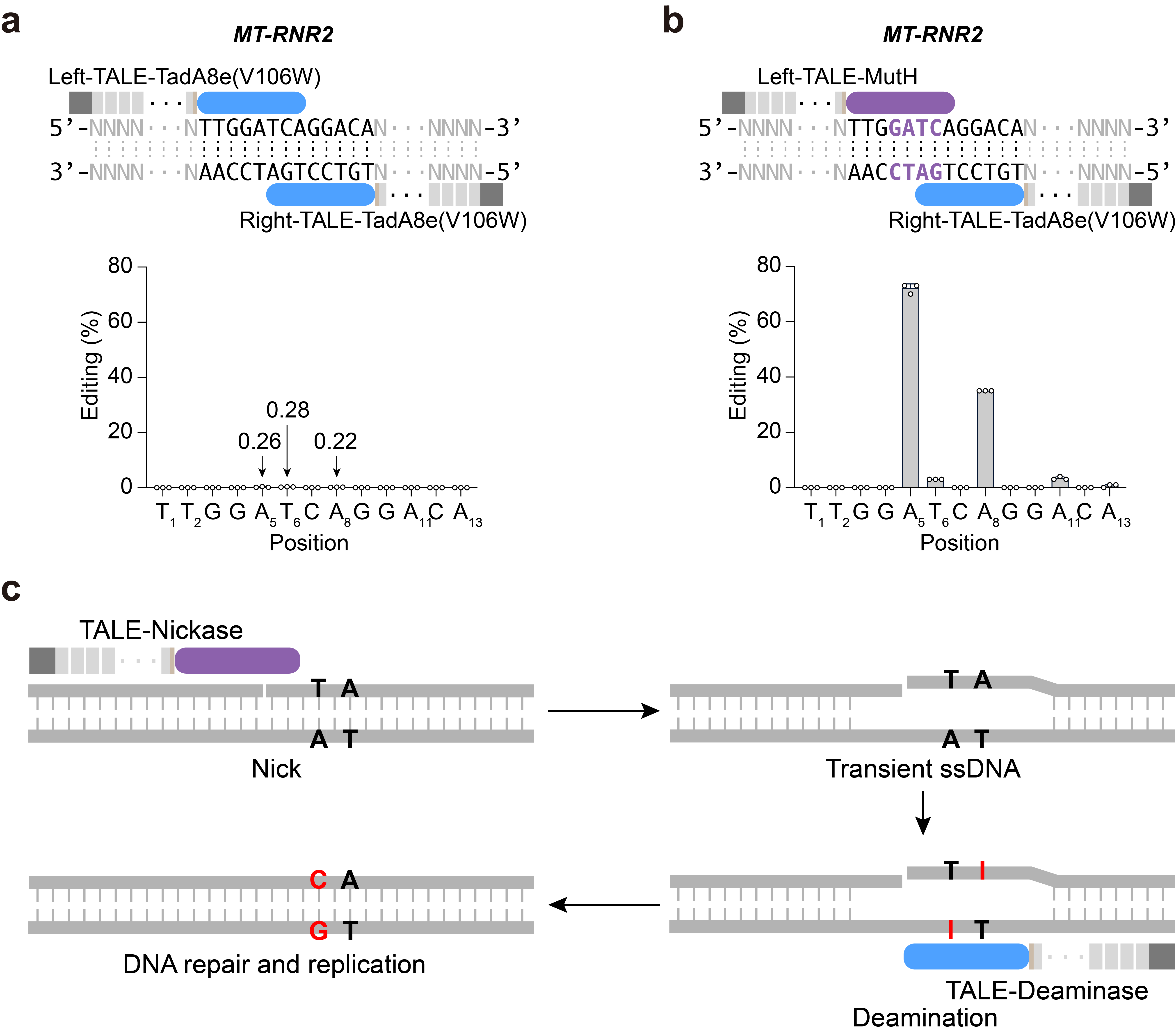 Fig.1 | CRISPR-free, strand-selective DNA base editing by introducing nickase. a,b, Mitochondrial A-to-G editing efficiency treated with paired TALE-TadA8e(V106W) (a) and Left-TALE-MutH and Right-TALE-TadA8e(V106W) (b) at MT-RNR2 site. c, A speculative working model for mitoBEs. TALE-nickase binds and nicks the dsDNA. The nicked dsDNA is prone to form ssDNA, which allows the TALE-deaminase to deaminate. Following DNA repair and replication, editing results on the non-nicked strand are preserved. TadA8e(V106W) was used for mitoABEs in this model. This model also applies to mitoCBEs.