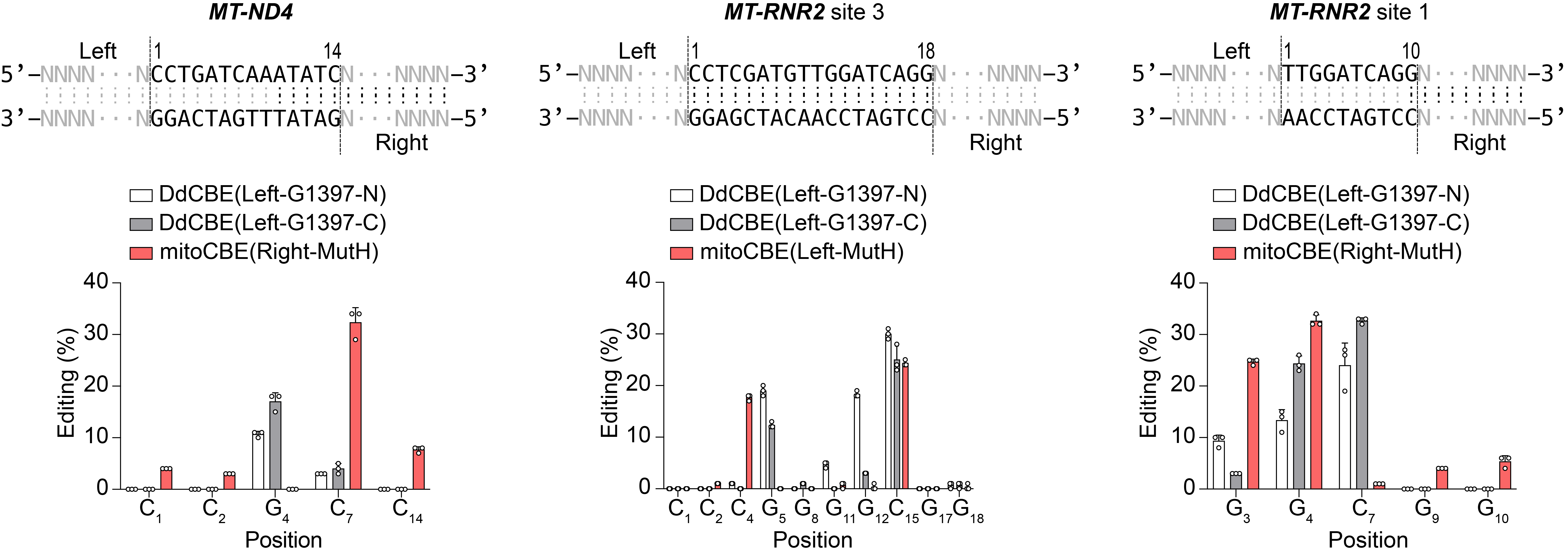 Fig.3 | Compare the editing profiles of mitoCBEs and DdCBEs at MT-ND4 (Left), MT-RNR2 site 3 (Middle), and MT-RNR2 site 1 (Right). Data are presented as mean values ± s.d. of n = 3 independent biological replicates.