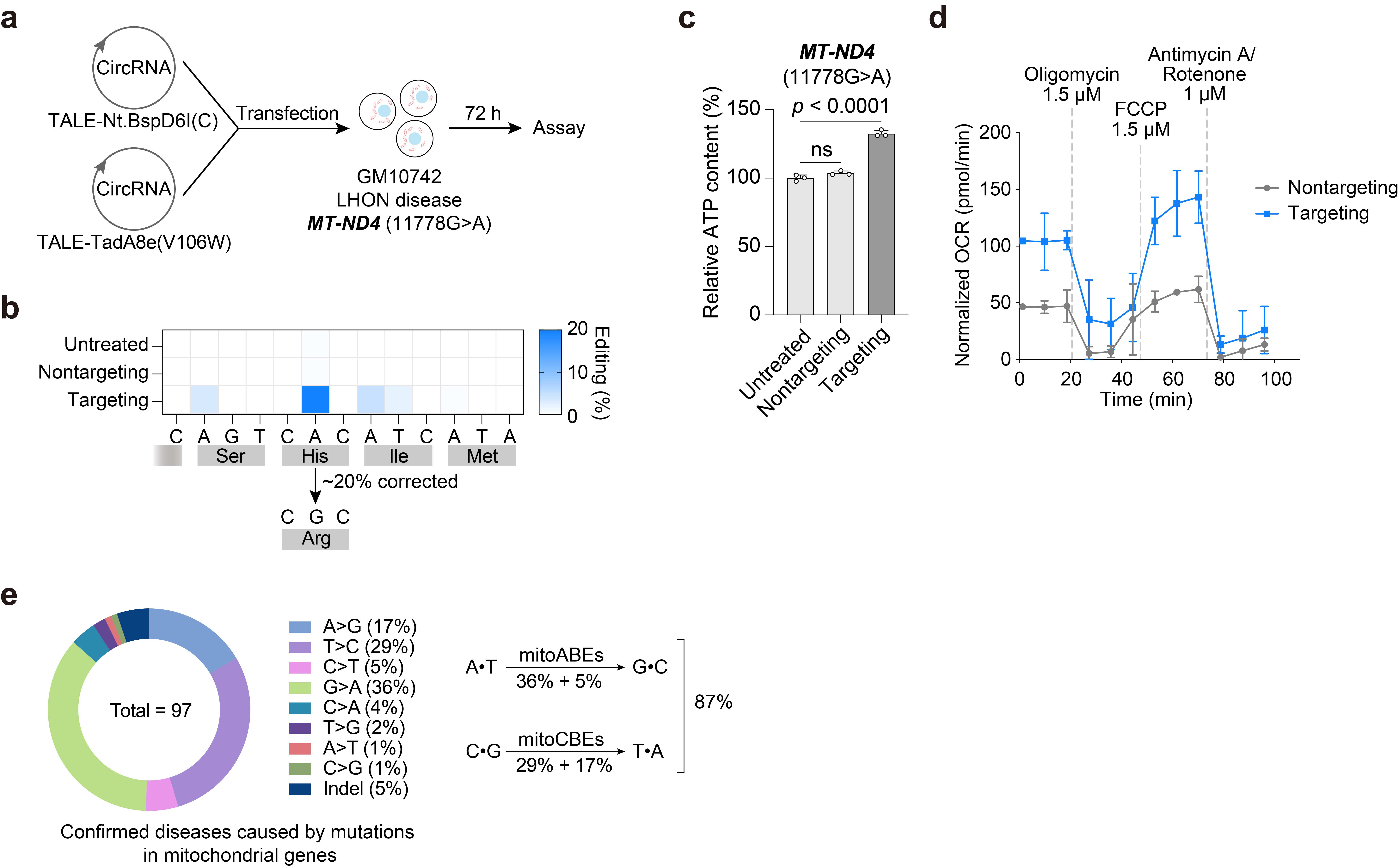 Fig.4 | Circular RNA-encoded mitoABEs successfully corrected the mutation in the LHON patient-derived disease cells. a, Overview of circRNA-encoded mitoABENt.BspD6I(C) transfected LHON disease cells GM10742, and genomic DNA was collected 3 days post-transfection. b, The editing efficiency of mitoABENt.BspD6I(C) corrected the 11778G>A mutation of LHON disease cell GM10742. c, The ATP levels of cells transfected with circRNA-encoded mitoABENt.BspD6I(C) targeted the 11778G>A mutation of LHON disease cell GM10742. Student’s T-test, p-value = 6.98E-05. d, OCR of the LHON disease cell line GM10742 treated with circRNA-encoded mitoABENt.BspD6I(C) targeted the 11778G>A mutation for 2 days. e. Types of mitochondrial diseases (MITOMAP) and the proportion of diseases that can theoretically be treated by mitoBEs. For b, the mean values from n = 3 biologically independent replicates are shown. For c and d, the data are presented as mean values ± s.d. of n = 3 independent biological replicates.