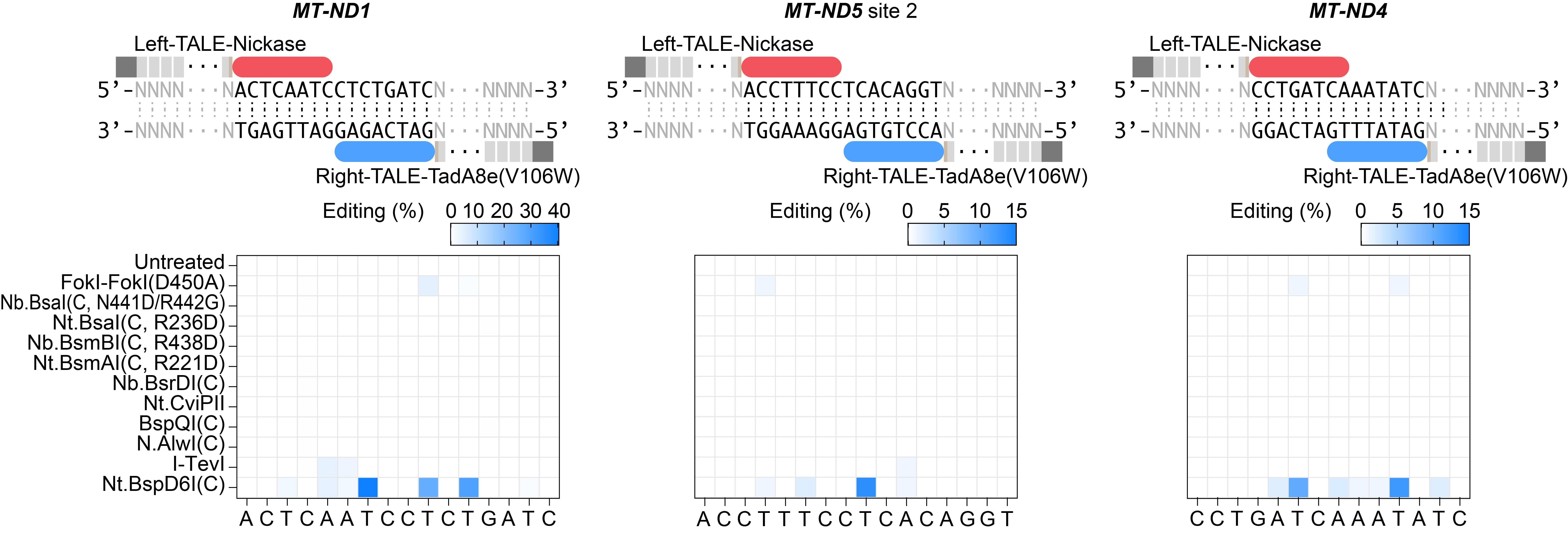 Fig.2 | Screening nickases without recognition sequence restriction for mitoBEs. Nickases without sequence restriction or with extensive recognition sequences were screened for mitochondrial base editing at three sites. The mean values from n = 3 biologically independent replicates are shown.