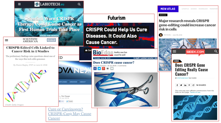In 2018, Nature Medicine published back-to-back manuscripts that claimed CRISPR-based genome editing could enrich for cancer mutations1,2. While the articles themselves were not exactly alarmist, the headlines they garnered certainly were (see below). This apparent cancer scare thus sent share prices of CRISPR companies into freefall as investors reconsidered the toxicity potential of this powerful technology.