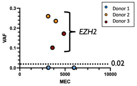 In hindsight, we were so glad we included this bad guide, since those were the only mutations we found in any of the 500 cancer genes in any sample (see below)! To our astonishment, one of the HSPC donors had no detectable mutations in EZH2. Upon closer investigation, we found that this donor had a single pre-existing variant at the intended cut site. This alone was able to completely prevent Cas9 activity - even when we were trying to cause it. This accidental finding was a lucky albeit profound demonstration of the incredible specificity of HiFi Cas9.