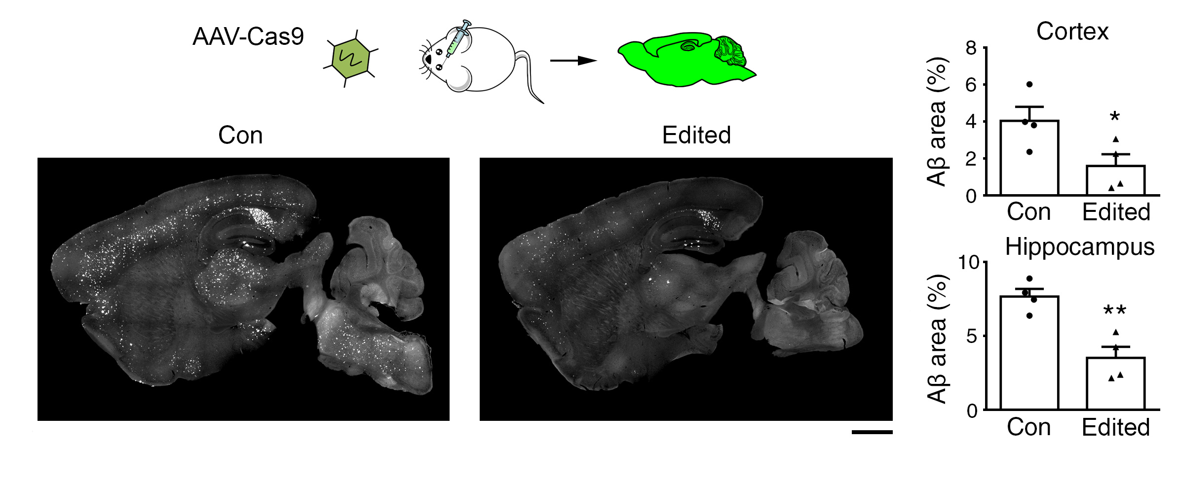 Firstly, we adopted the PX601-based AAV-Cas9 construct [4] with modification of the promoter by replacing the cytomegalovirus (CMV) promoter with a smaller elongation factor 1-alpha short (EFS) promoter. We packaged this construct into AAV9, which can infect the brain cells with high efficiency via intrahippocampal injection. We then found that intrahippocampal delivery of this AAV9-Cas9 system into the brains efficiently edited the APP Swedish mutation in the virus-infected brain regions (~30% of genome-editing efficiency), suggesting this Cas9 system works well in vivo.