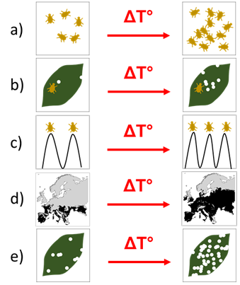 Figure 1: Increasing impact of insect pests with climate change is caused by several factors: including faster population growth (a), higher metabolism (b), increasing number of generations (c) and changing distribution range (d) all contribute to higher yield losses (e) in warmer temperatures. Scheme by Dominique Mazzi and Marc Grünig.