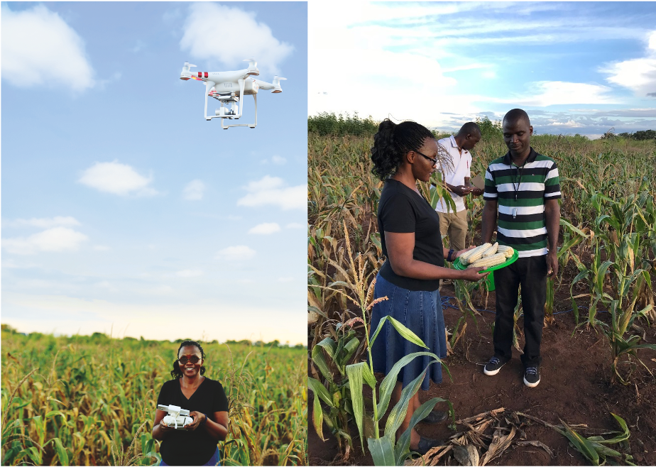 Dr Ivy Ligowe flying a drone for aerial photography of a farmer’s field in Malawi, and training field teams for crop sampling (photo: Rob Ounsworth)