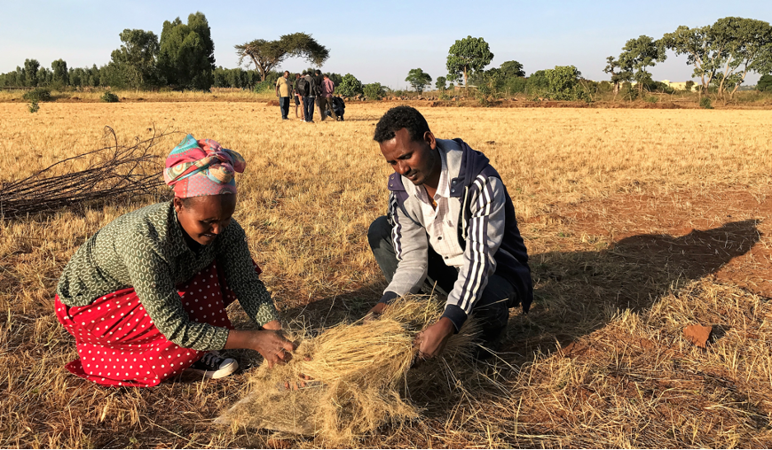 Colleagues from the Amhara Region Bureau of Agriculture hand-threshing teff, a small-grained staple cereal crop, in a farmer’s field in Amhara region, Ethiopia (photo: Martin Broadley)