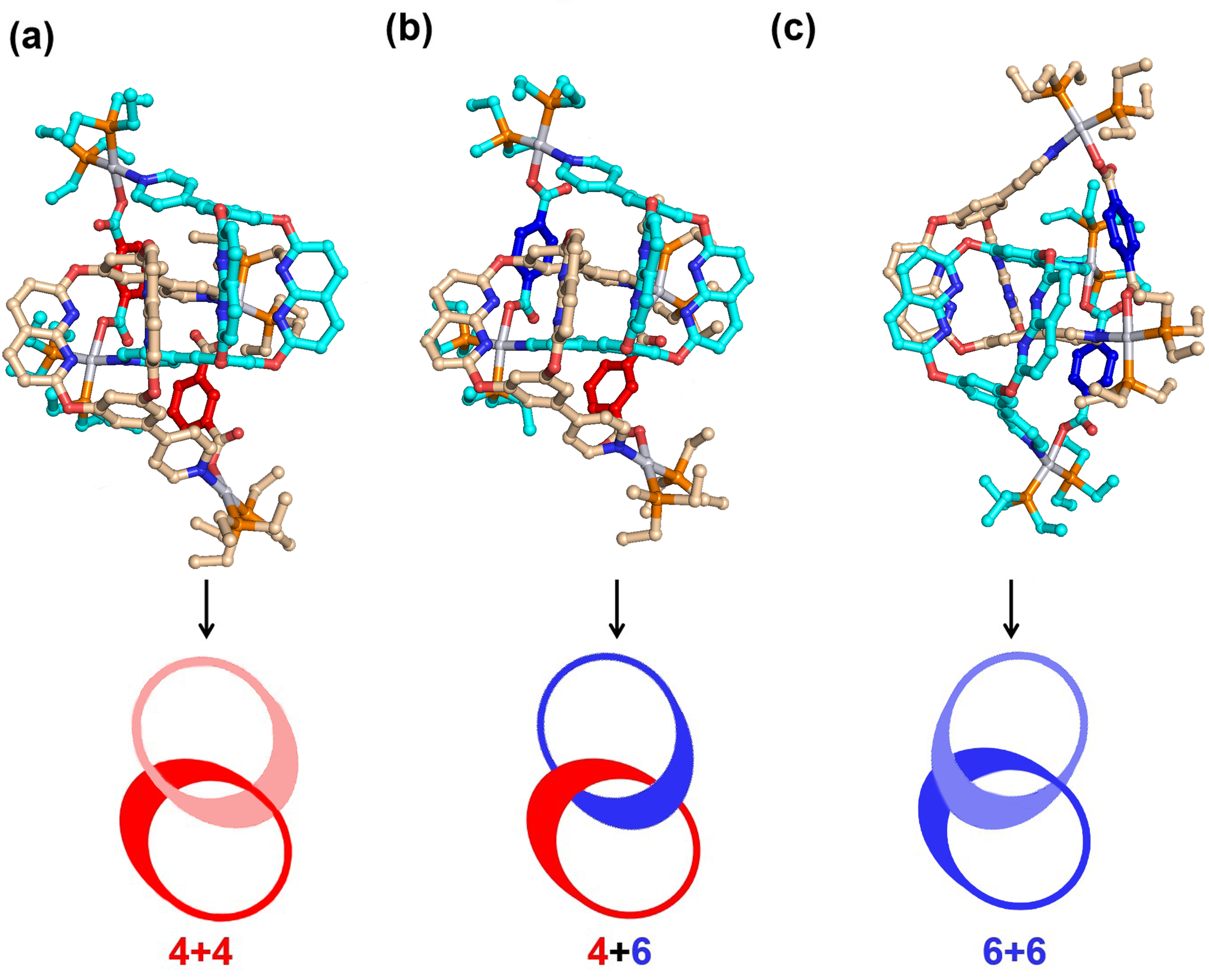 To evaluate the stabilities and mechanisms of cross-catenation, TGMin (v.3) program was employed to search the GM structures of three catananes. In total, 67320 structural isomers of 4+4, 54589 isomers of 4+6, and 55020 isomers of 6+6 were searched, respectively, among all the possible structures. Subsequently, the GM structures of 4+4, 4+6 and 6+6 were re-optimized by using B3LYP exchange-correlation functional in Gaussian program (Figure 4).