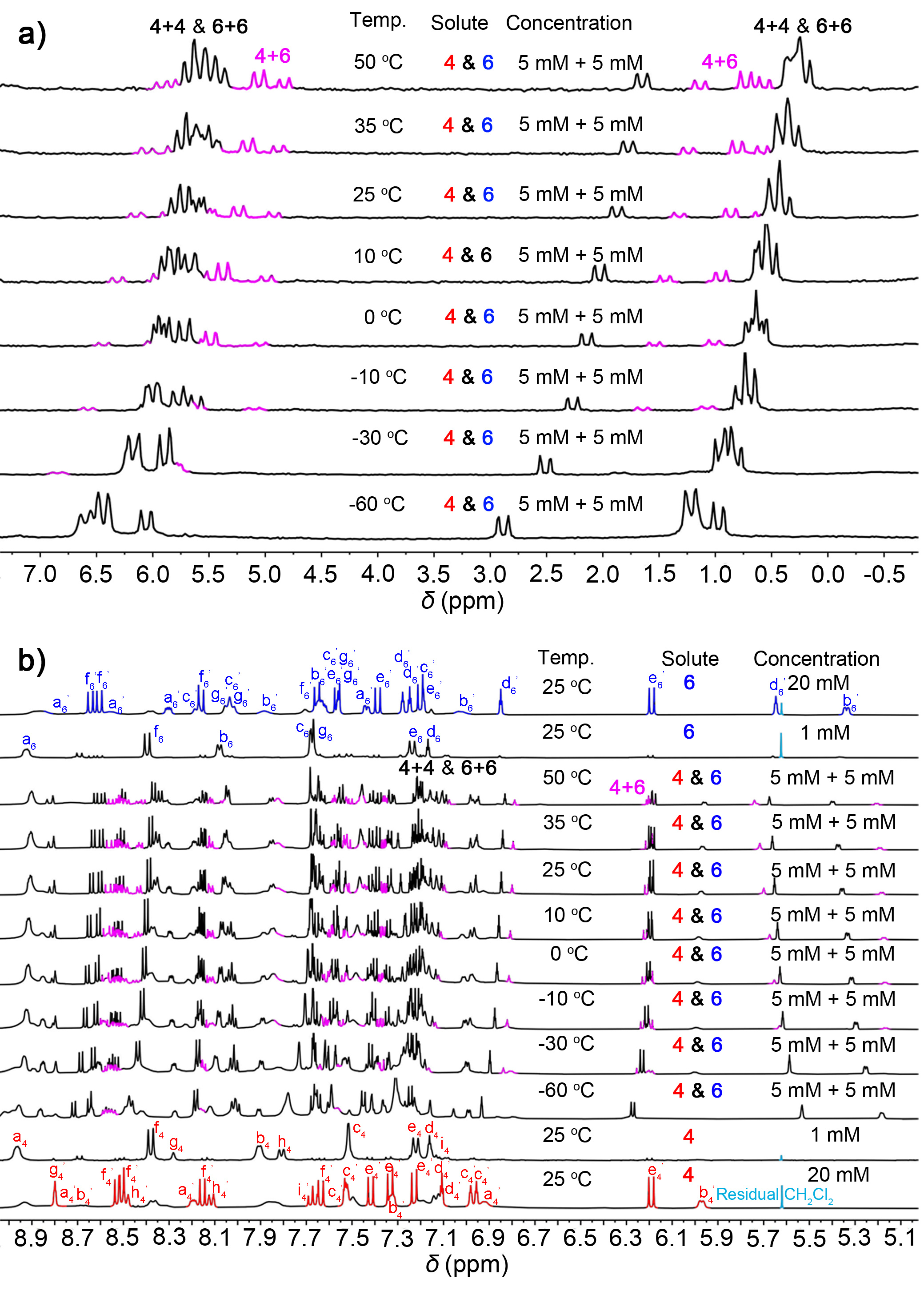 To verified the generation of cross-catenane in solution, we used 1H NMR experiments to characterise cross-linking in solution. When the concentration of 4 and 6 in the 1:1 mixture in acetone-d6 solution was gradually increased, several broad peaks were observed from 5.0 to 9.0 ppm in the 1H NMR spectra. We expected this based on the complex chemical environment that exists in 4+6. Then, we investigate the stimuli-response of this hierarchal assembled system, we conducted 1H & 31P{1H} NMR (5 mM for each) spectra in acetone-d6 at different temperatures. As shown in Figure 2a, the 31P{1H} NMR & 1H NMR spectra clearly shown signals belongs to the cross-catenane 4+6 at high temperature (pink peaks), while the chemical shifts of 4+4 & 6+6 are occurred due to the temperature variation. However, as the temperature decreased, the signals of cross-catenane were disappeared, and the spectra indicated two self-catenanes (4+4 and 6+6) are the main product in the mixture. This suggests that the dynamic library of catenanes is influenced by temperature, indicating that the cross-catenane 4+6 is more thermodynamically stable than self-catenanes. That is, heating disrupts the self-catenanes, resulting in the formation of more thermodynamically stable cross-catenanes.
