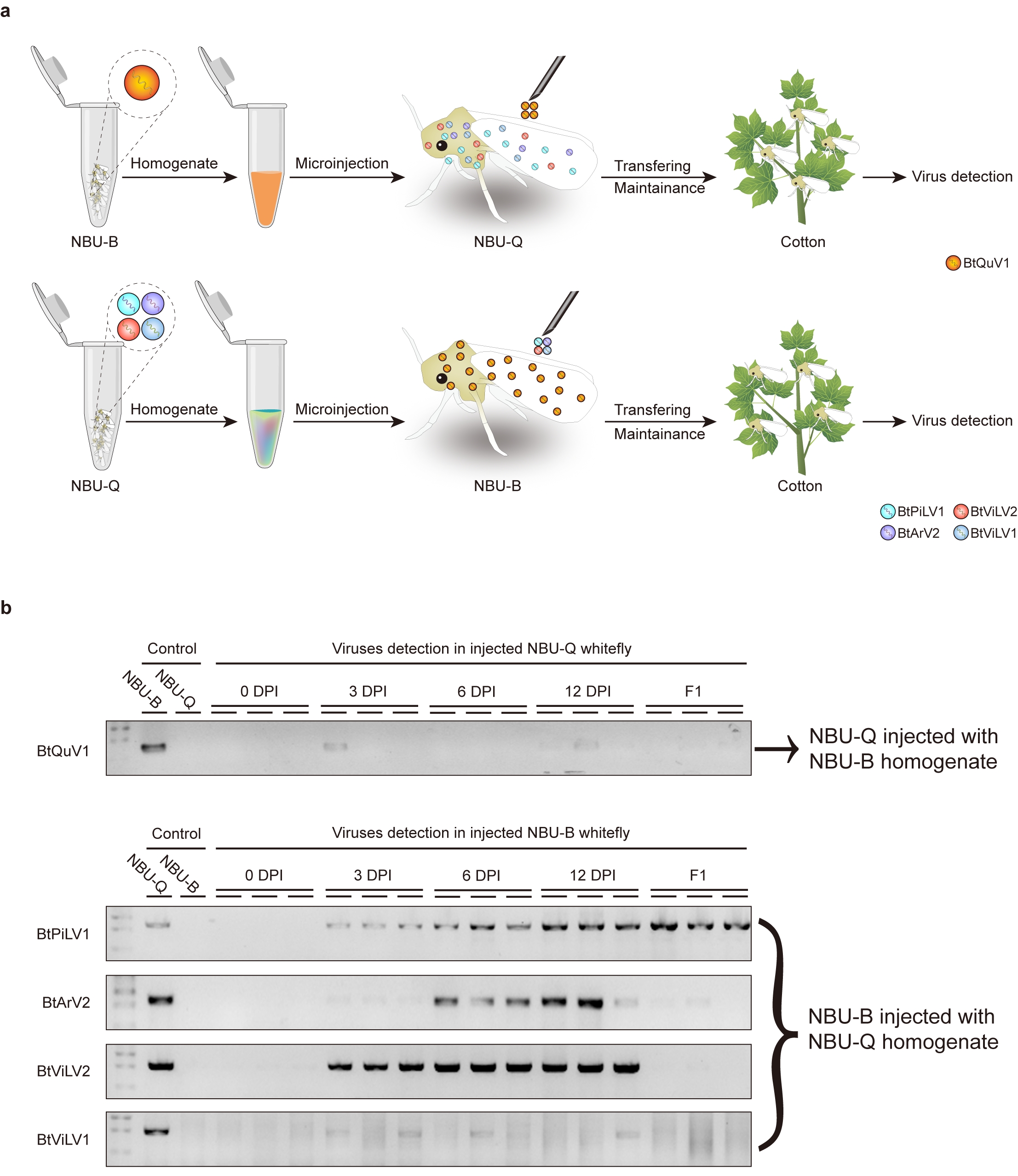 Figure 1. Evaluation of the ability of insect-specific viruses to cross-infect the cryptic whitefly species MEAM1 and MED. (a) Diagram illustrating the experimental workflow. In the upper panel whitefly individuals of NBU-Q (representing cryptic species MED) were microinjected with homogenate of NBU-B (representing cryptic species MEAM1). The reciprocal injection of NBU-B with homogenate of NBU-Q whiteflies is shown in the lower panel. (b) Detection of insect-specific viruses (ISVs) 0, 3, 6, 12 days post-injection (DPI), and in the next generation (F1). The presence of ISVs in each whitefly sample was determined by RT-PCR. Untreated NBU-B and NBU-Q whiteflies were used as controls. A pool of 20-30 whiteflies was collected for MEAM1 and MED whiteflies at each time point, and three independent biological replicates were performed. Abbreviation of virus names, BtArV2, Bemisia tabaci arlivirus 2; BtPiLV1, Bemisia tabaci picorna-like virus 1; BtQuV1, Bemisia tabaci quaranjavirus 1; BtViLV1, Bemisia tabaci virga-like virus 1; BtViLV2, Bemisia tabaci virga-like virus 2.