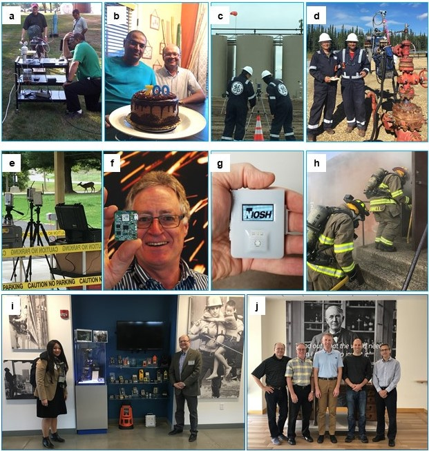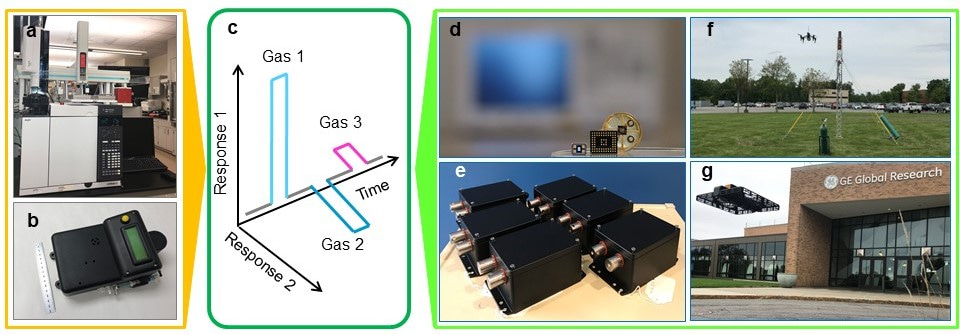 Reflecting on unexpected discoveries reported in our article in May issue of Nature Electronics, I would like to share the phases of our journey – learning, refining, and optimizing our dielectric excitation scheme as well as learning from end-users about their critical pain points. Our extensive results in pristine lab conditions and environmental chambers were intriguing but initially puzzling since decades of prior work with AC excitation (a.k.a. impedance spectroscopy) of SMOX sensing materials did not even hint at the characteristics we observed. Then we moved to early outdoor tests (Fig. 2a) for initial detection of dynamic gas plumes. Our system enhancements allowed us to detect gas leaks as far as 700 ft (i.e. 213 meters) away (see Fig. 2b depicting a small celebration). Working with our partners, we conducted numerous field validation tests (Fig. 2 c-e) that have proven the field applicability of the developed sensor solutions. Our work is expanding into wearable (Fig. 2f-h) and drone-integrated (Fig. 1f,g) sensor solutions. We are industrial scientists (Fig. 2i,j) and we are exploring commercialization opportunities with prospective partners for diverse markets.