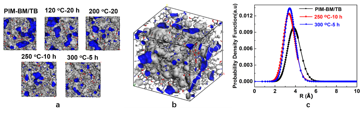 Fig. 2 Characterization of PIM-BM/TB and XPIM-BM/TB membranes physical structures. a representative chain conformations in crosslinked PIM-BM/TB from computer modelling results. b 3-D view of crosslinked PIM-BM/TB modelling structure in an amorphous cell (300 oC-5 h). (cell size: 30*30*30 A; density of ~ 1.X g/cm3 grey: Van del Waals surface; dark grey: Connolly surface with pore radius of 1.45 A). c pore size distribution from PALS.
