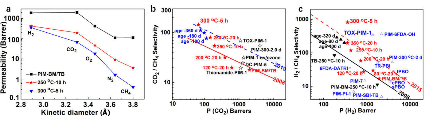 We further characterized the membrane using the ultimate tool – gas permeation with both single gas and mixed gas permeation to locate the membrane separation performance on the upper bound plots. Different gases, including H2, CO2, O2, N2 and CH4 were selected as molecular rulers to measure the gas transport properties in membranes as shown in Fig 3a. The light gas, like H2, penetrate much faster than heavy gas, like CH4. As a result, the membranes display unprecedented molecular sieving feature for CO2/CH4 and H2/CH4 separations, placing our membranes far above the upper bound limits including the latest 2019 upper bounds as shown in Fig. 3b and 3c. What is more, the membranes exhibit much higher gas selectivity than the majority of PIMs membranes and their derivatives reported in prior literatures.