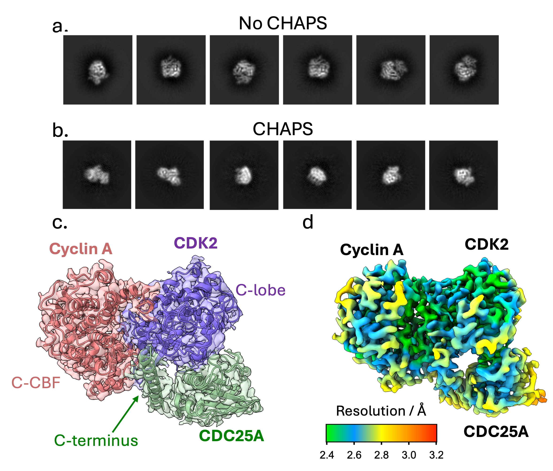 To generate a stable ternary complex for cryo-EM studies, CDK2 was phosphorylated on Tyr15 and Thr160, and CDC25A was catalytically inactivated by C431S mutation. During preliminary data collection, we encountered difficulties with preferential orientation, Figure 1 a, resulting in poor 3D refinement. A suitable specimen was subsequently obtained by spiking the complex with CHAPS detergent to improve the orientation distribution, Figure 1 b. High-resolution data collection was performed on a 300 kV FEI Titan Krios and data were processed to yield a 2.7 Å map, showing clear density for the quaternary architecture, secondary structure, and side chain organisation of the ternary complex, Figure 1c-d.
