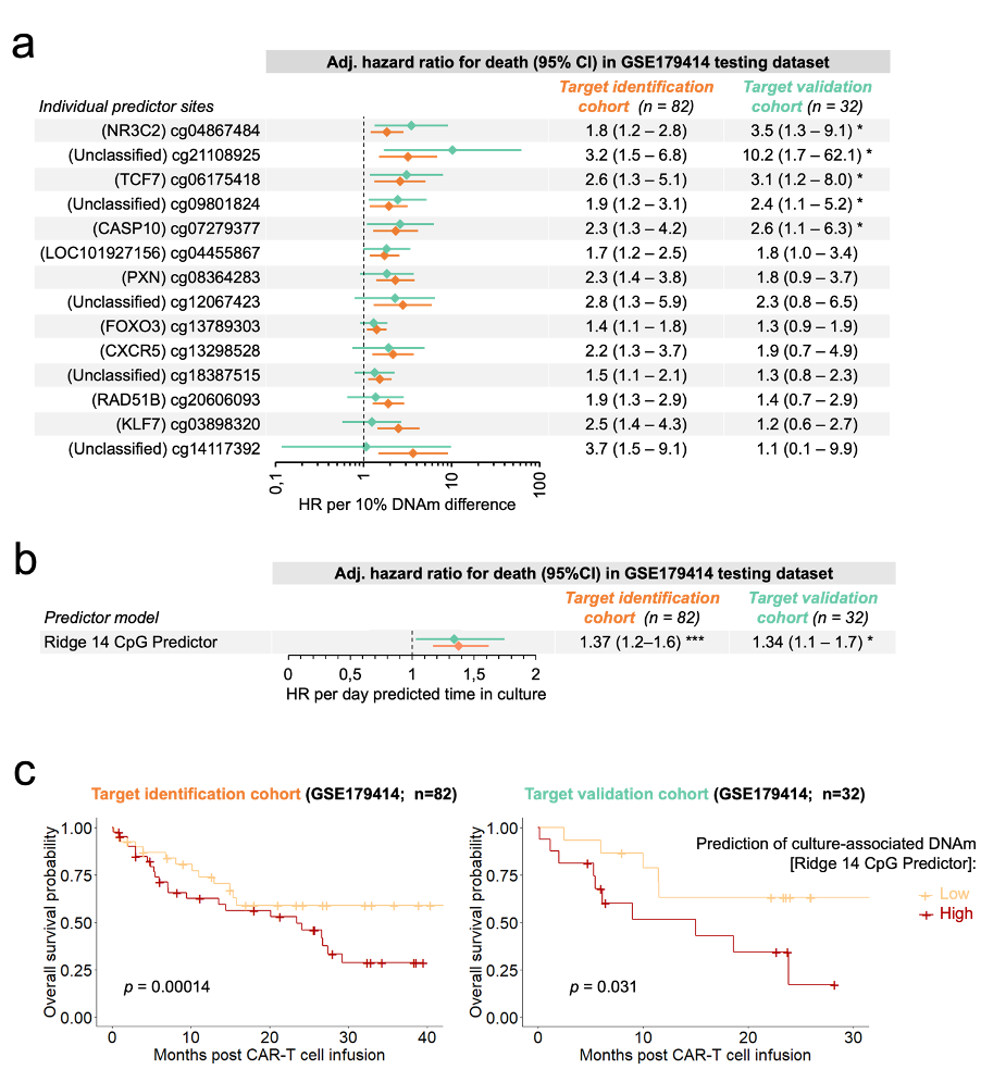 a. Hazard ratios (HRs) of 14 CpGs association with overall survival in target identification cohort (orange; n = 82) and the target validation cohort (turquoise; n = 32). b. HR for the culture-time-predictions from the model comprising 14 survival associated CpGs. c. Kaplan–Meier estimates of overall survival. Cohorts were divided into low and high estimates of culture-associated DNA methylation.
