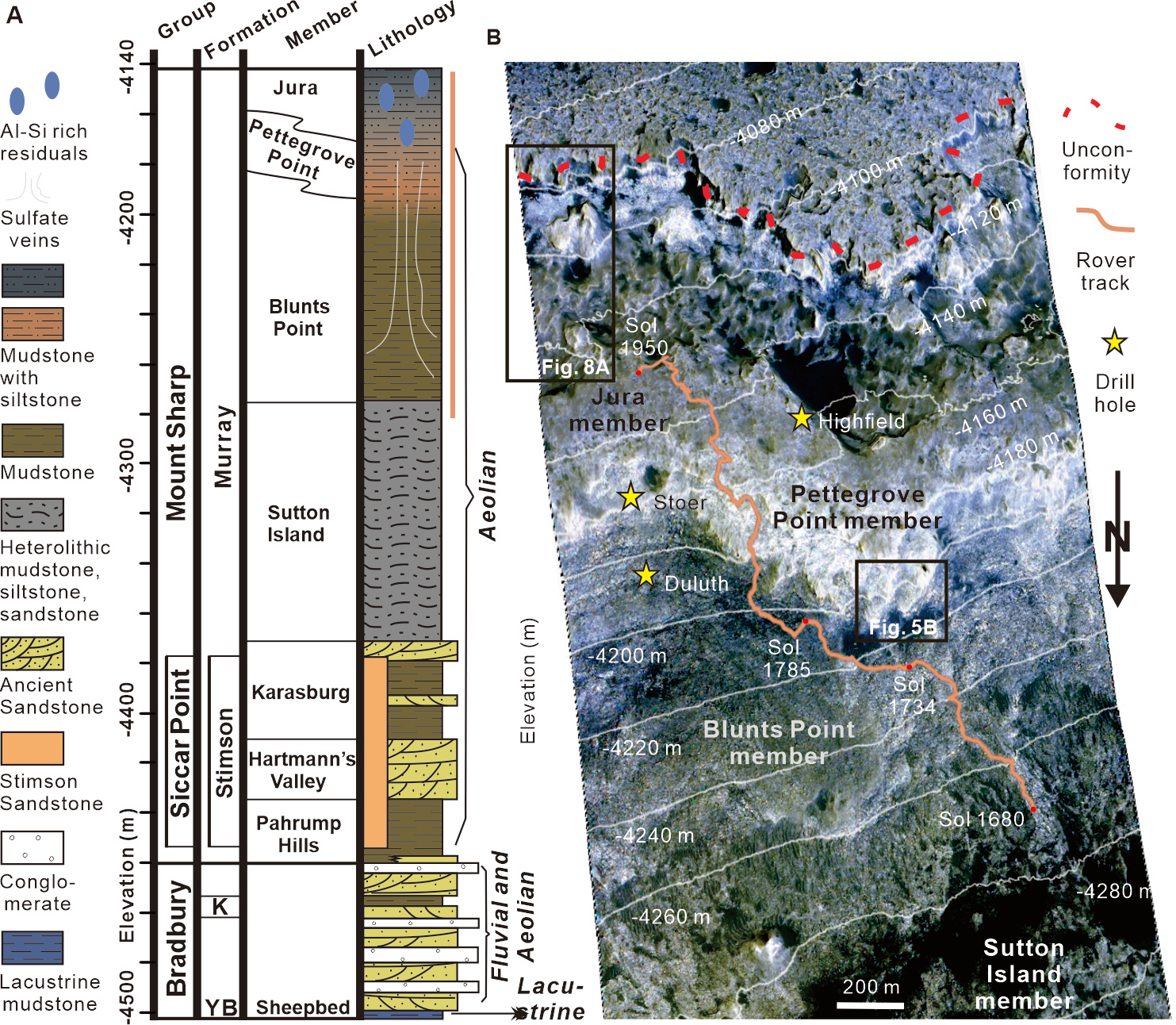 Figure 2: The stratigraphic column and Curiosity rover’s traverse in Gale crater. At the left is a stratigraphic column of the rocks in Gale crater. At the right is an image from the High Resolution Imaging Science Experiment (HiRISE) showing Curiosity's traverse between the Sutton island and Jura members. The solid orange line is the traverse between Sol 1680 and Sol 1950.