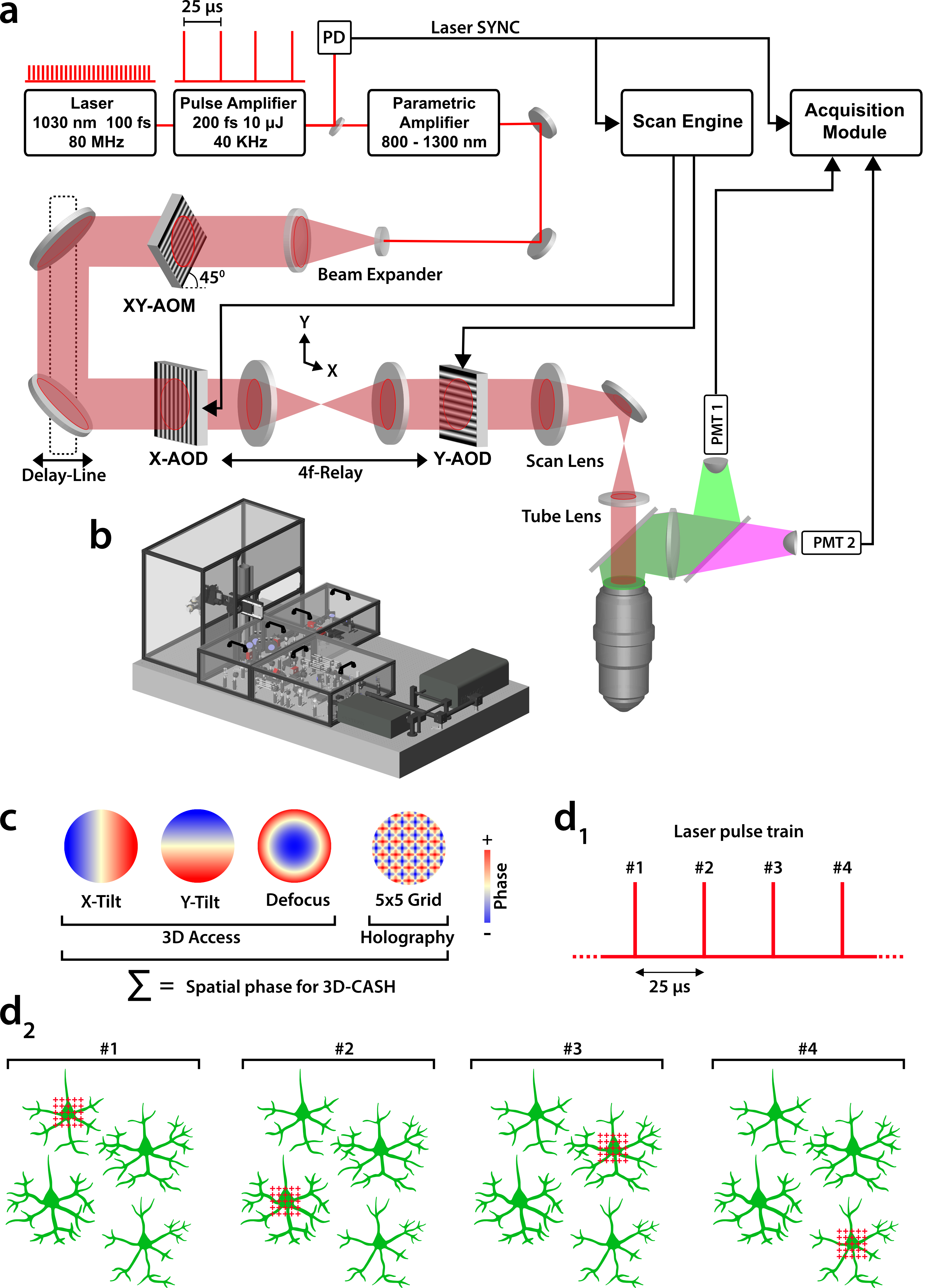 a) Schematic of a self-built two-photon microscope for CASH recording of neuronal activity. Phase and amplitude modulation of femtosecond laser pulses from a chirped pulse amplifier is performed by two acousto-optic deflectors (AODs) with crossed active axes (X,Y directions) mutually conjugated via two achromats in 4f configuration and together conjugated to the objective back aperture through a scan and a tube lens. The two AODs are synchronized to the laser clock by means of a laser emission signal from a photo diode (PD). As a third active element, a single acousto-optic modulator (AOM) is inserted into the beam path for compensation of temporal and angular dispersion produced in the two AODs. b) 3D representation of the whole setup. c) Principal phase modes used in CASH: Phase tilt in x- and y-direction and z-defocus for volumetric random access together with a holographic phase for focal light patterning. d) Illustration of the CASH sampling protocol in 2D. In a laser pulse train (d1), single pulses are provided with customized spatial phases such that every pulse accesses a different cell (green) with a 5x5 excitation grid (red) covering the cell body and the near peri-somatic space (d2). Shown is a group of four neurons at different times isochronous with laser pulse emission (pulses #1 to #4). 3D-CASH addresses cells in arbitrary 3D locations in a 500 x 500 x 400 µm3 volume in arbitrary order at constant sampling speed. For every laser shot the grid pattern can be adapted to fit the target cell.